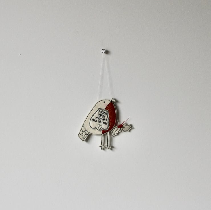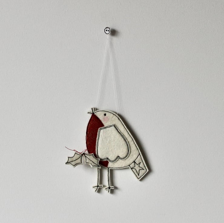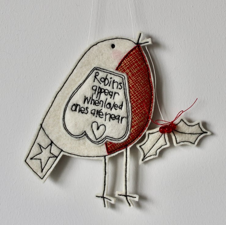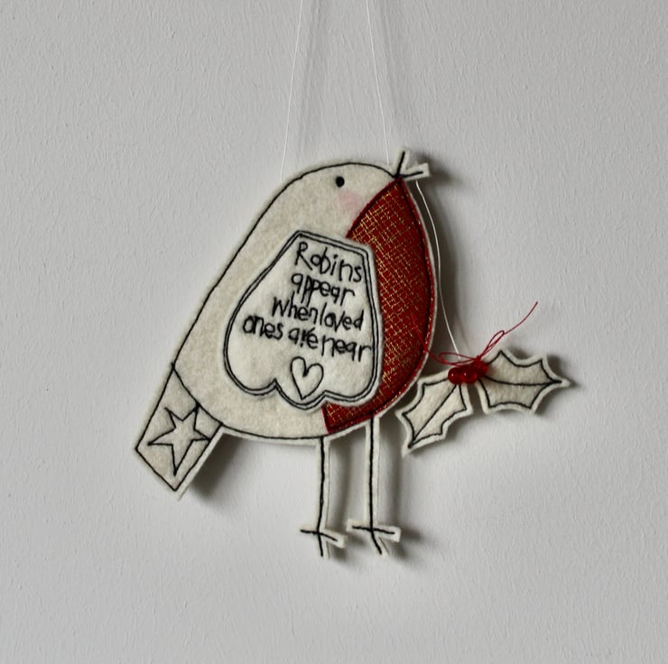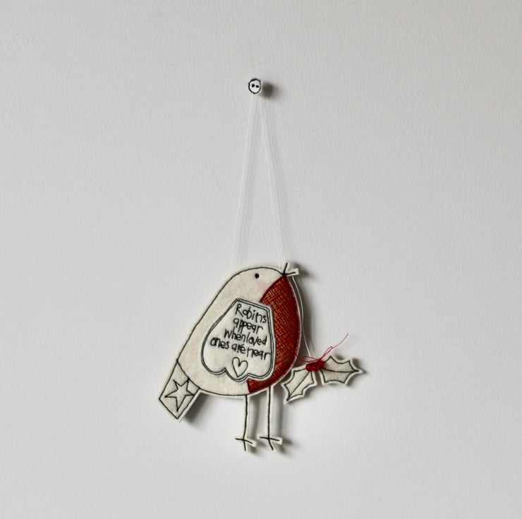 With a red breast, Mr Robin has a star on his tail, holly with glass bead berries suspended from his beak and the sentiment 'Robins Appear when Loved Ones are Near' sewn on his wing.