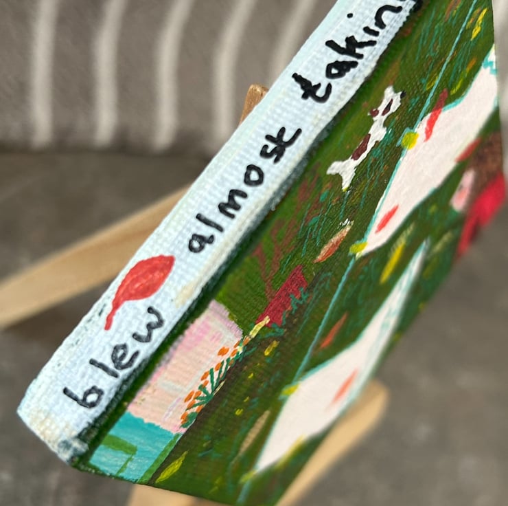Original painting depicting a very very windy day. This is part of a series of small paintings of a child in a red jumper. They could be coming home after a playing out. Ready to go home perhaps for a nice warm drink.
