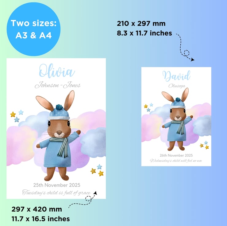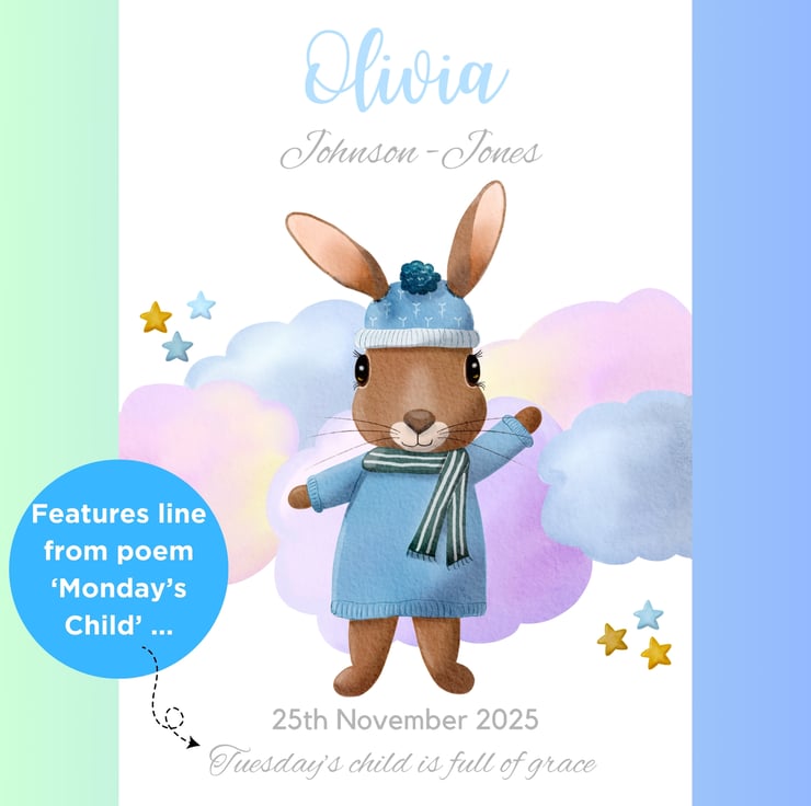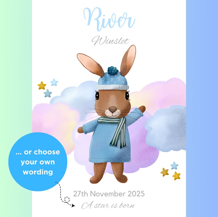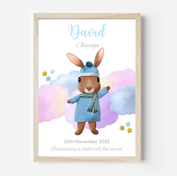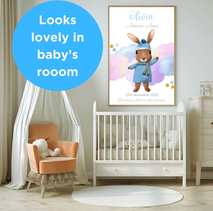 Cute bunny rabbits are a perennial nursery favourite. This sweet bunny looks soft and cuddly in her blue jumper. The artwork has been designed to appeal to girls and boys alike. I chose the colours to complement a range of nursery decor colour schemes and styles. I also wanted to create a soft and dreamy feel to the cloud background, perfect for creating a soothing environment in your little one's room.