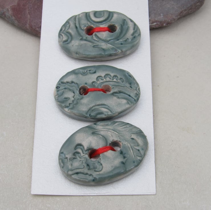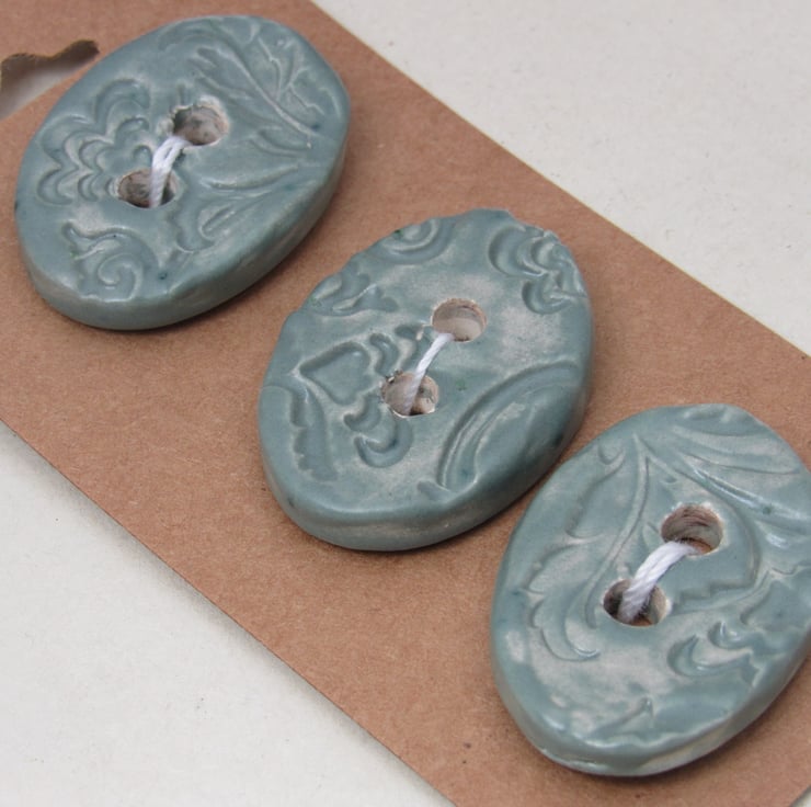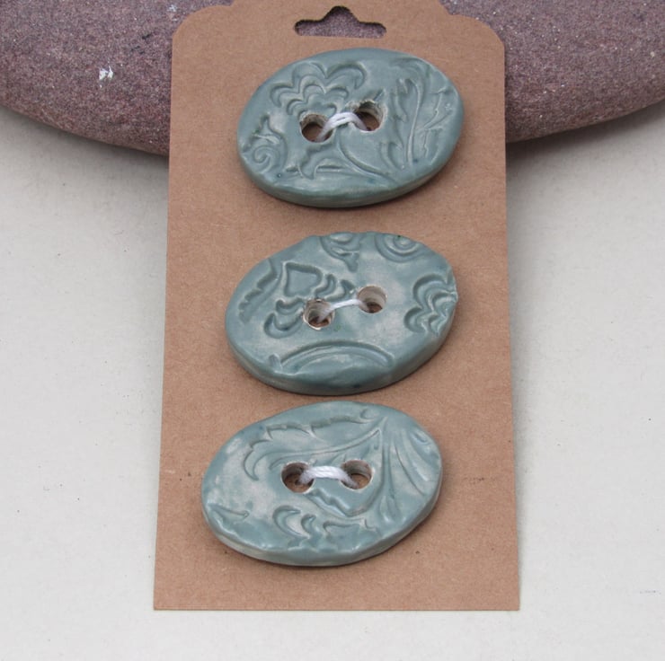 3 medium sized stoneware buttons, with a pretty brocade motif printed into the upper face. Finished with a semi-matte sage green glaze.