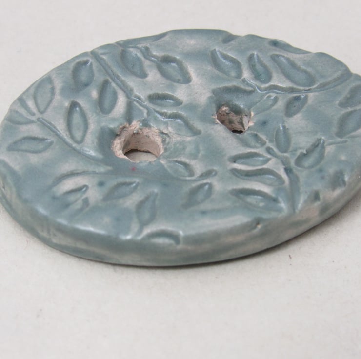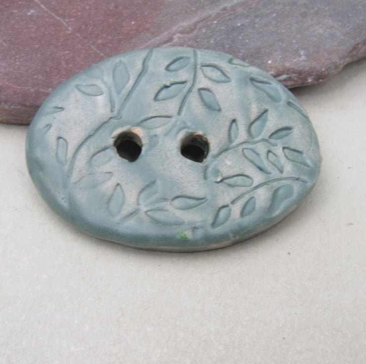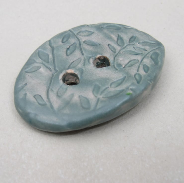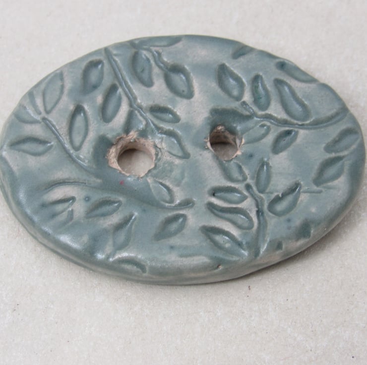 Medium oval shaped stoneware button, textured with a pretty motif of tiny leaves. Finished with a smooth sage-green glaze