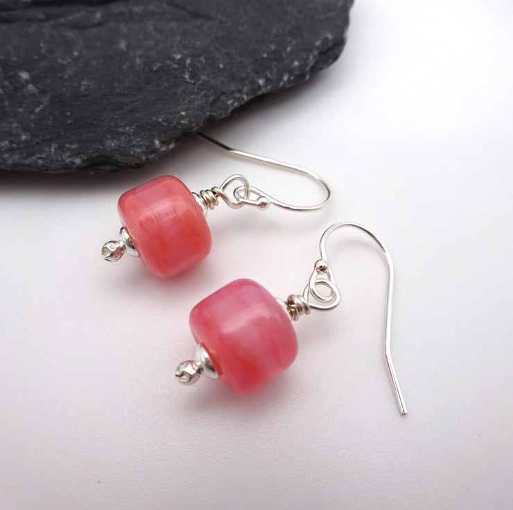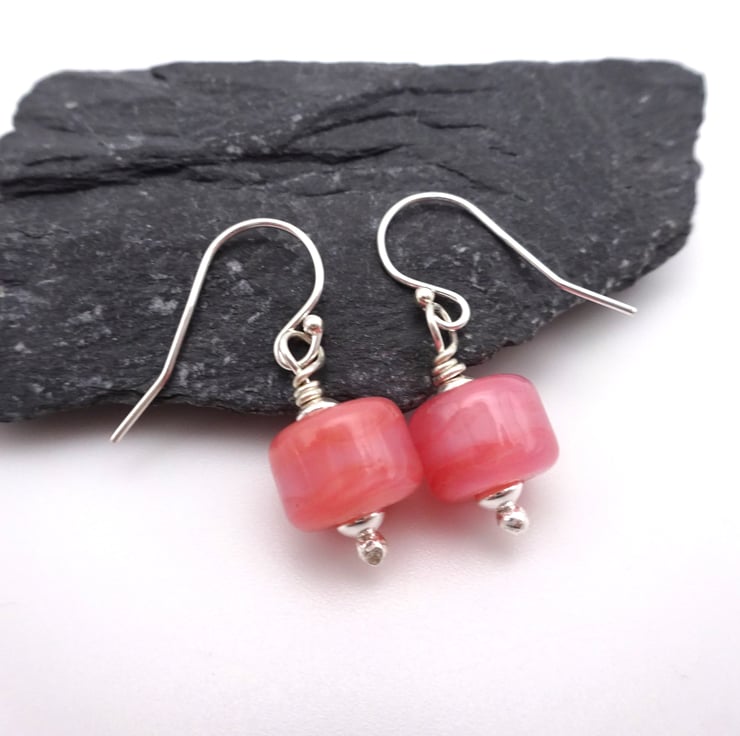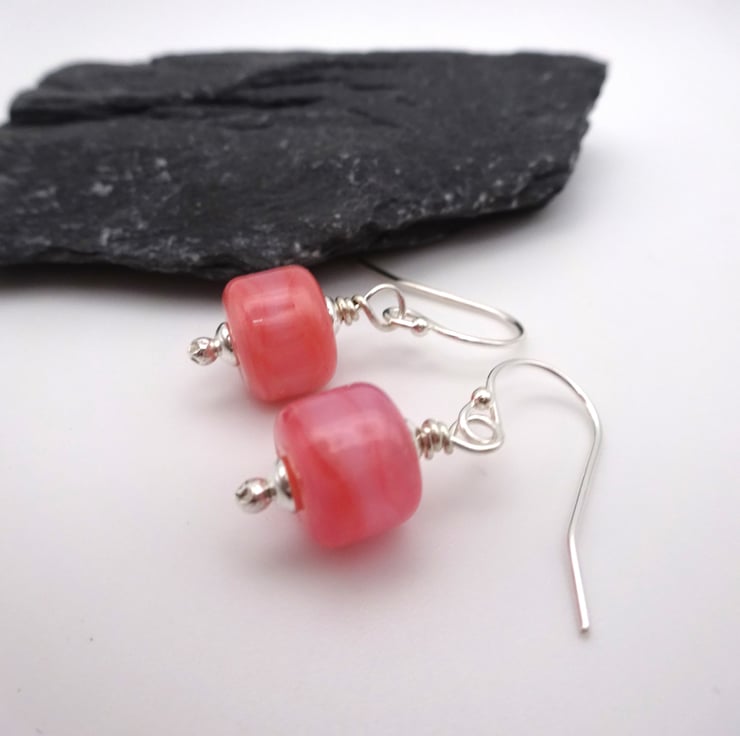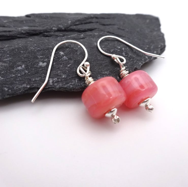 They feature sterling silver ear wires, sterling silver beads and handmade lampwork cloudy pink glass beads.