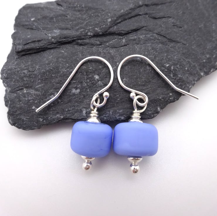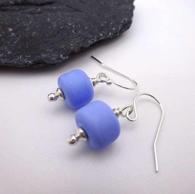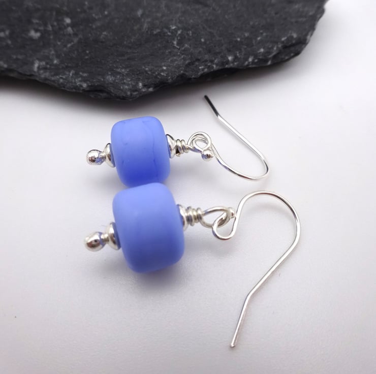 A pair of earrings which feature sterling silver ear wires, sterling silver beads and handmade lampwork blue glass beads which have been tumbled for a smooth finish.