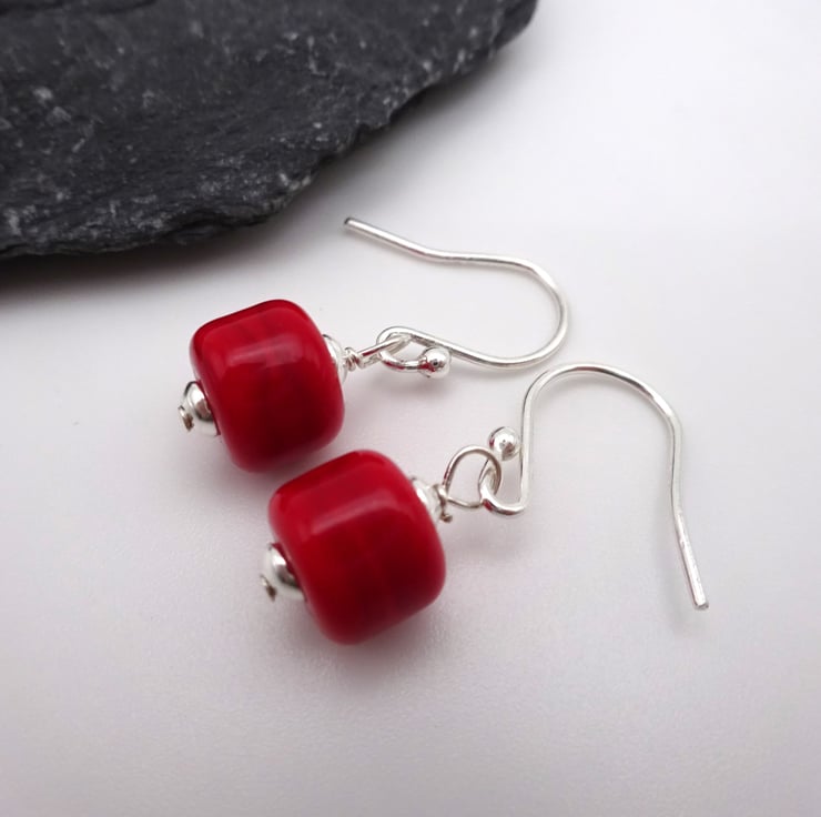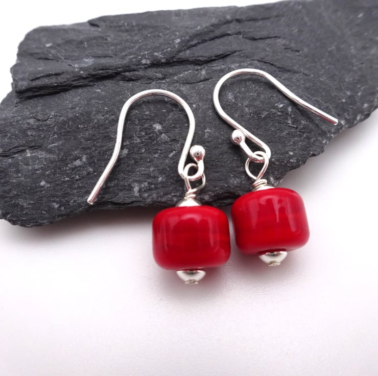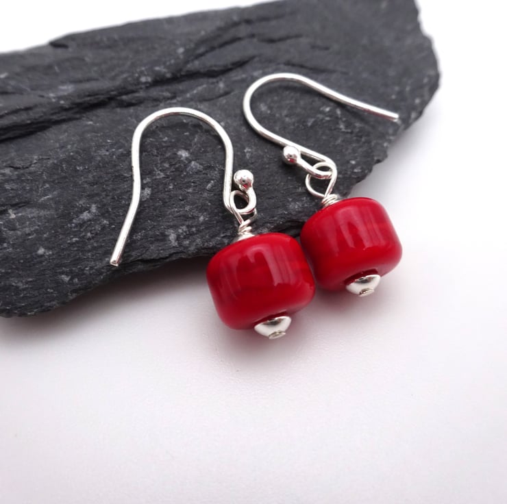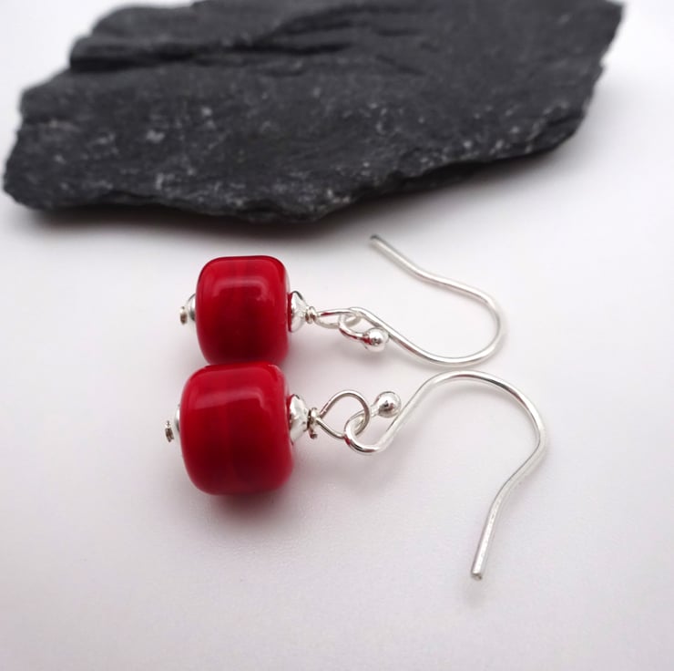 A pair of earrings which feature sterling silver ear wires, sterling silver beads and handmade lampwork red glass beads.