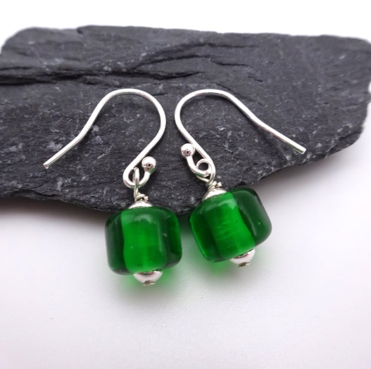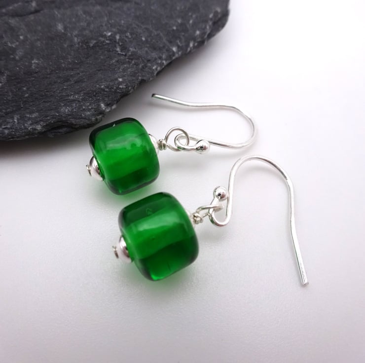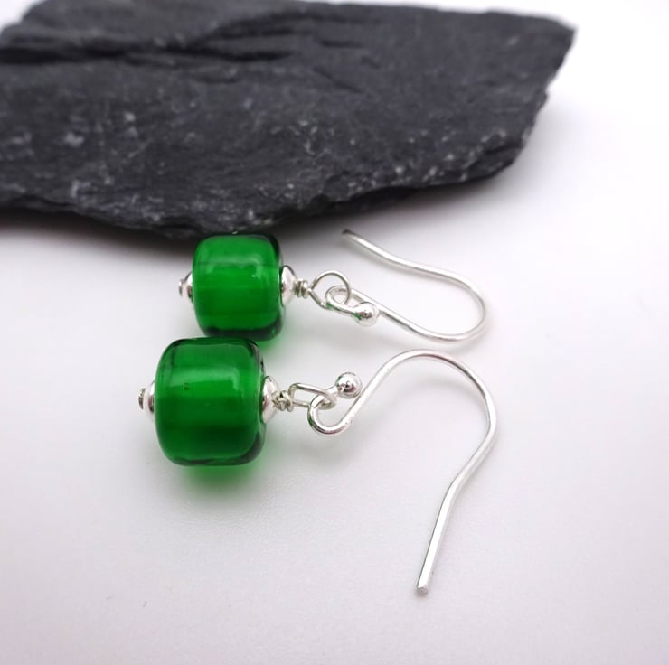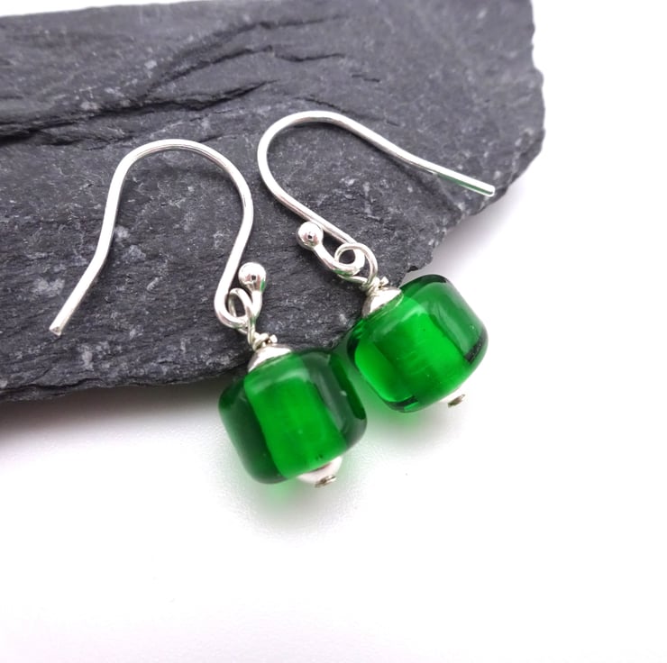 A pair of earrings which feature sterling silver ear wires, sterling silver beads and handmade lampwork transparent emerald green glass beads.