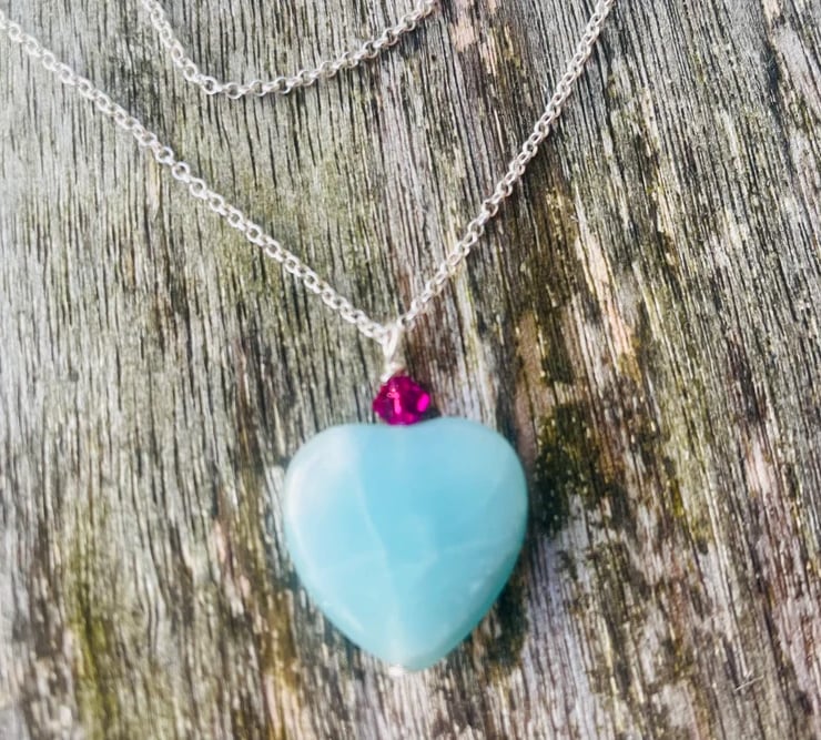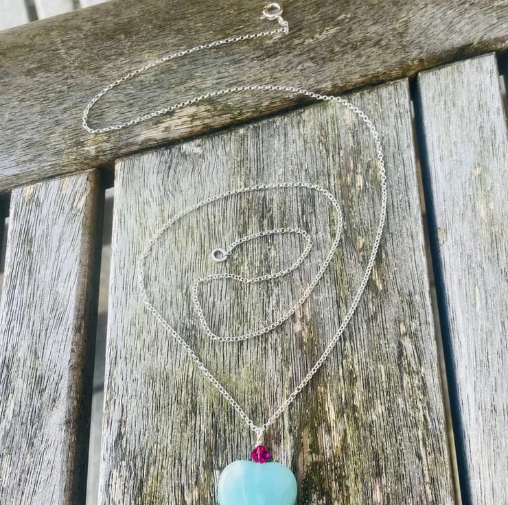A very pretty colour mix, Amazonite heart with a fuschia pink Swarovski Crystal on either a 16 inch sterling silver chain or a 18 inch sterling silver chain. Please not the Amazonite stone does show inclusions and this is a natural aspect of the actual stone and not a flaw.