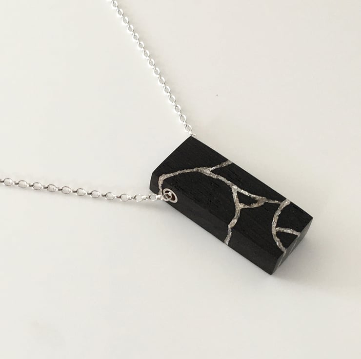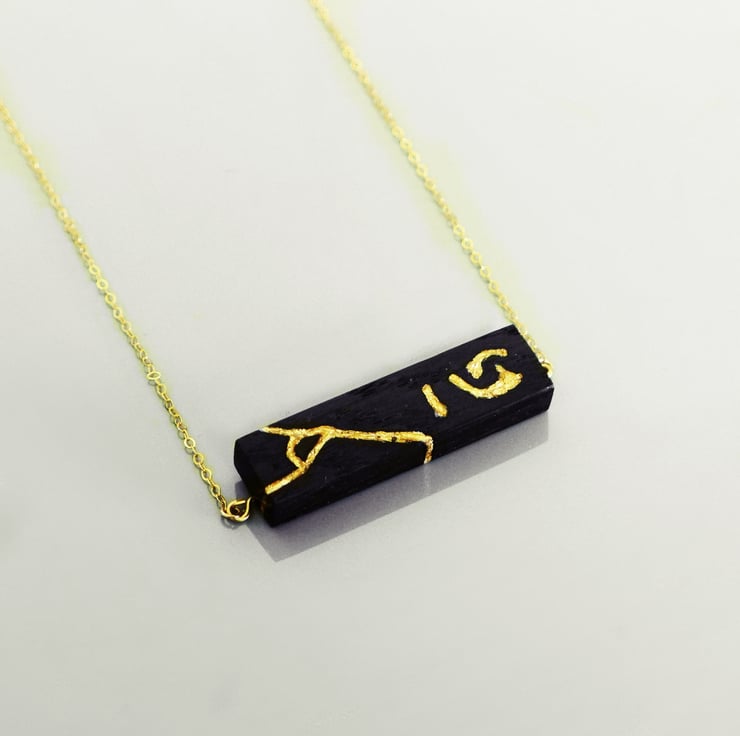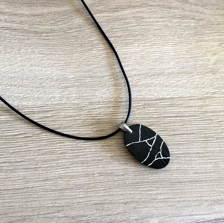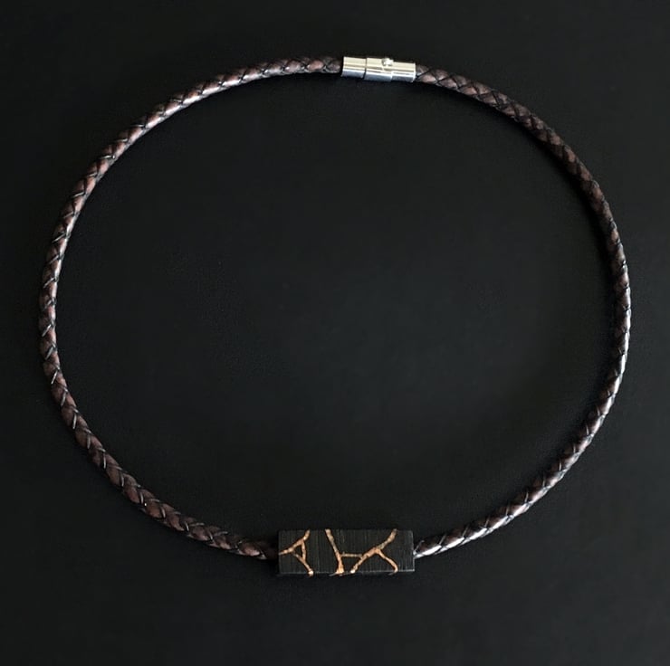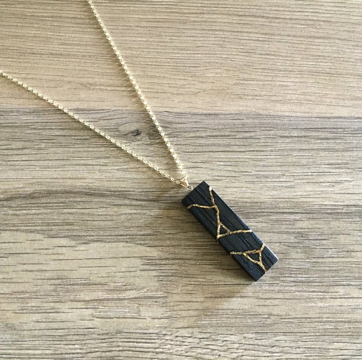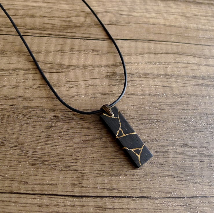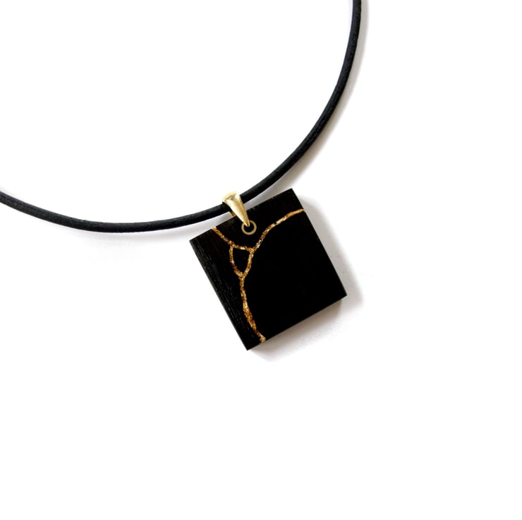 Kintsugi necklace with Chinese heart symbol made from 3200BC bog oak wood & inlaid with choice of 24ct gold, rose gold, fine silver or copper leaf. The inlay is set in the wood.