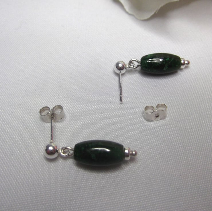 These delicate Jade earrings feature small barrel shaped genuine Jade beads dark green in colour finished off with a small flat silver ring & ball finial and come complete with silver ear posts and butterfly backs.