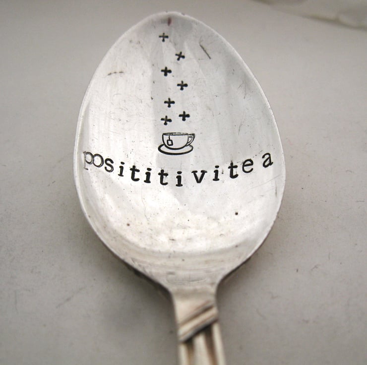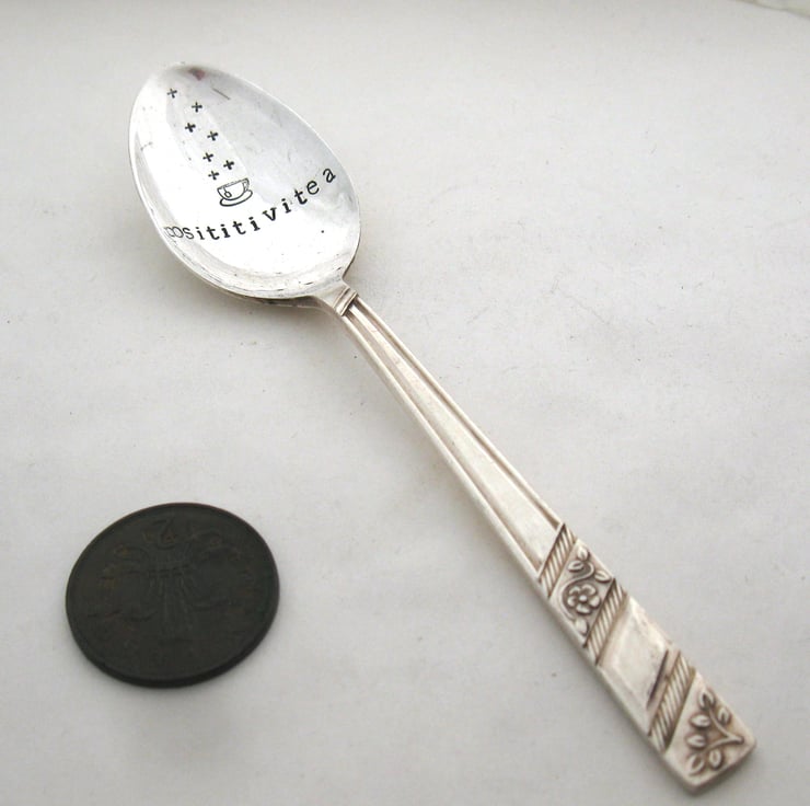 Oops. I meant to stamp 'positivitea' on a vintage teaspoon, but having started in the middle of the word I got a bit carried away with the 'i' and the 't' and repeated them so it reads 'posititivitea'. So it's now in the bargain bin and would maybe make a gift for a stutterer (provided they have a sense of humour) or maybe just for someone you think is a bit of a tit! Anyway there is also a little teacup icon with some 'plus' signs and I hope it'll still make someone smile. The wording is in black lettering in the bowl and the spoon is approximately 13cm long. It has a floral handle with rope twist detailing.