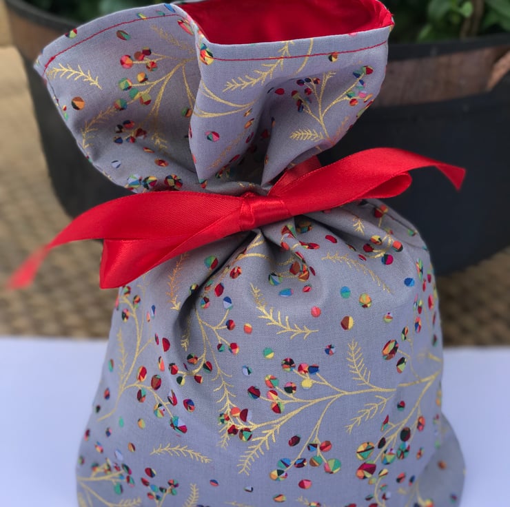 Luxury lined Christmas fabric gift bags for wrapping Xmas presents in a stylish and ethical way. These bags are completely reusable and a great way to save on paper waste