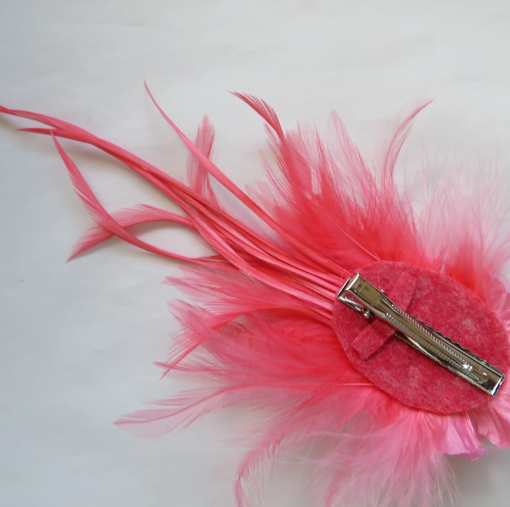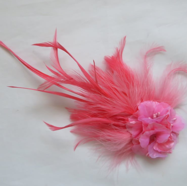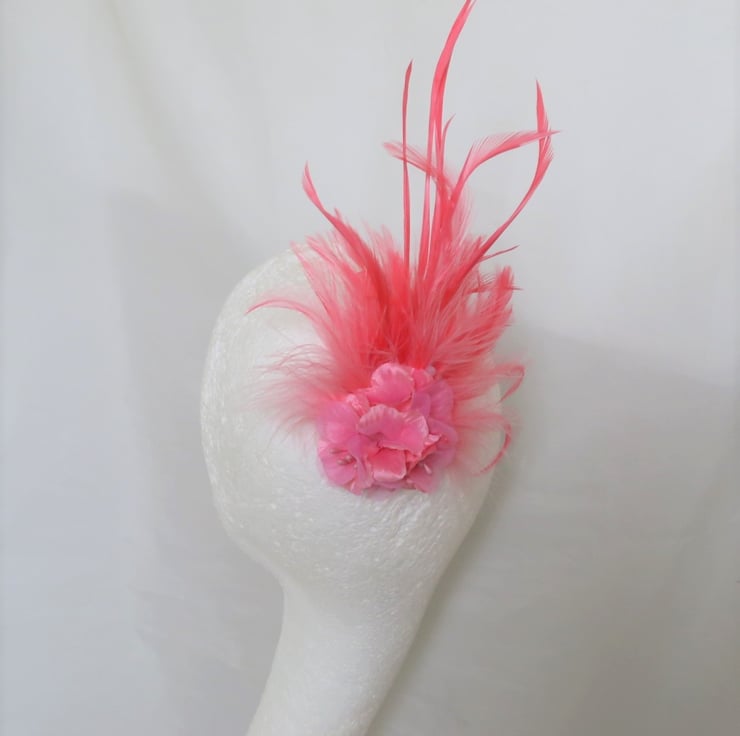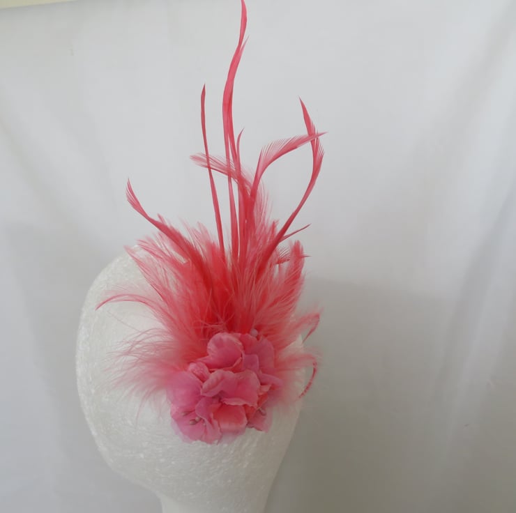This is a stunning and eye catching vintage Regency style bespoke feather plume clip headpiece in shades of coral flamingo pink.