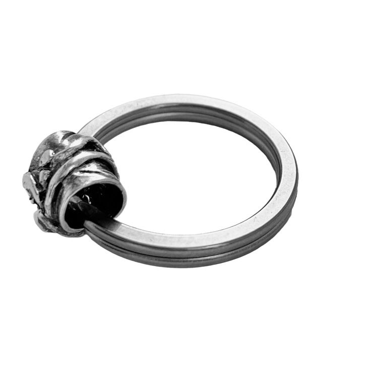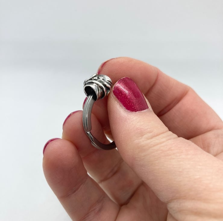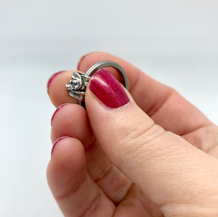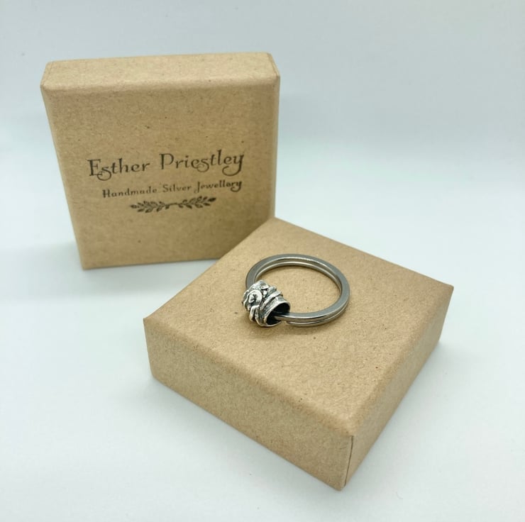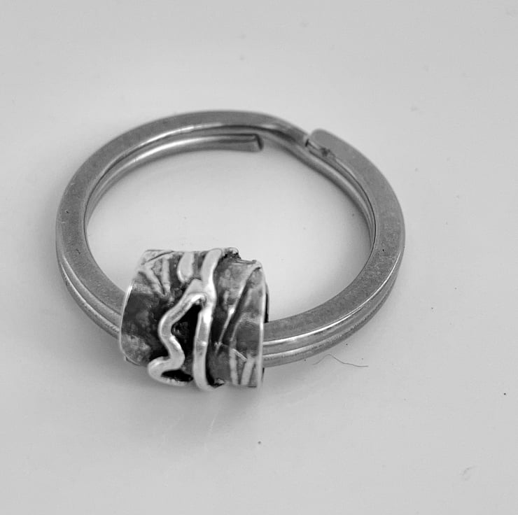 Handmade patterned silver bead on a stainless steel keyring.