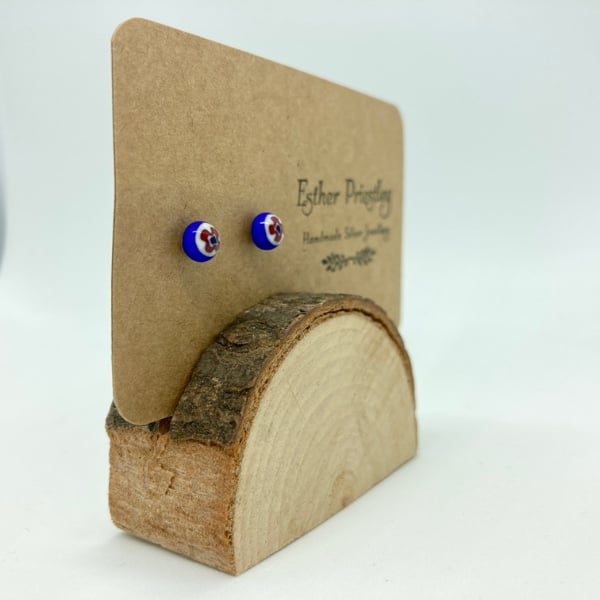 Tiny handmade earrings in blue and white glass with a tiny pattern in red on the top that looks like a small red poppy.