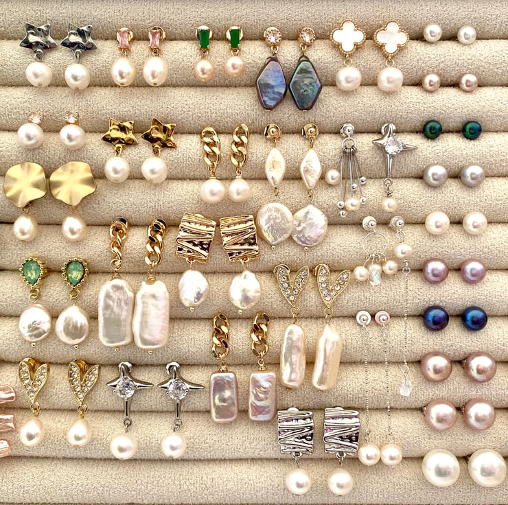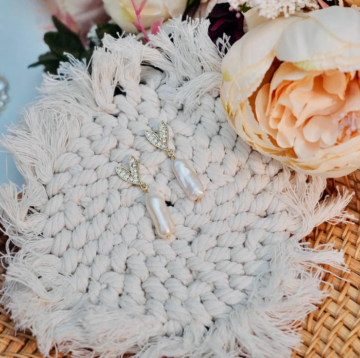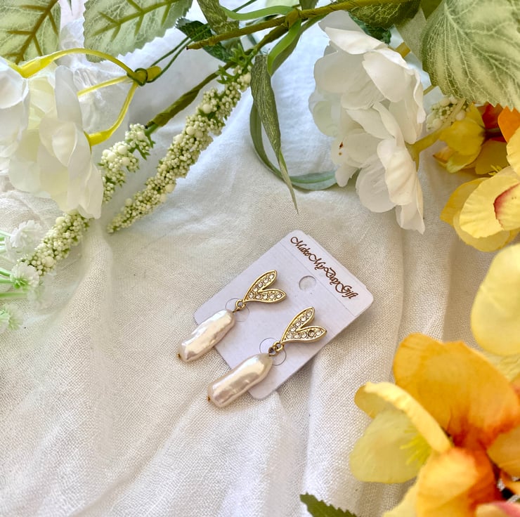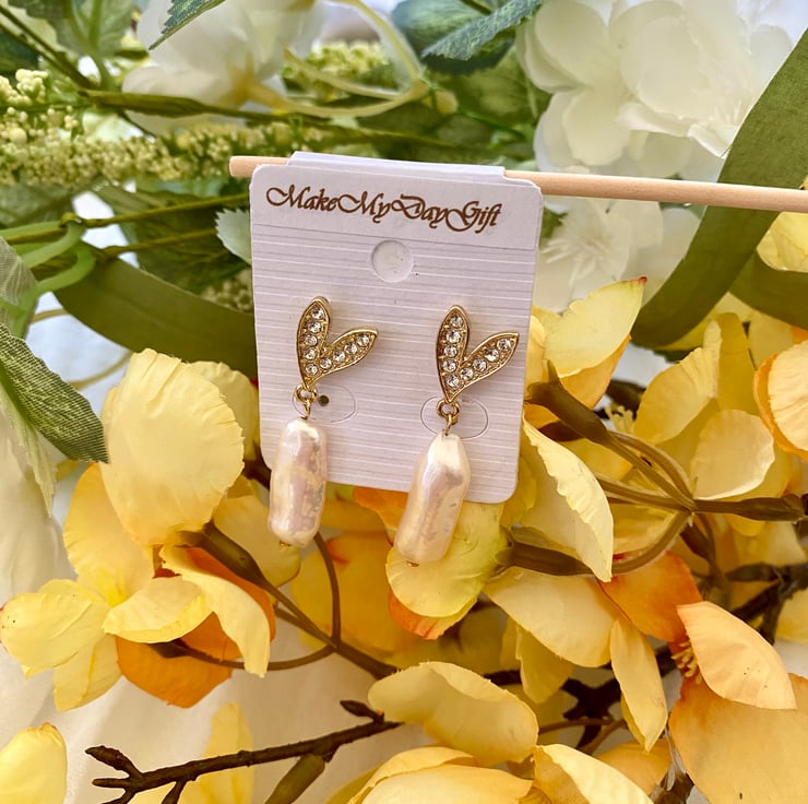 These delightful earrings showcase white sticky freshwater pearls elegantly paired with sparkling heart-shaped gold-plated rhinestone studs and stainless stud pins. Their shimmering accents make them a perfect accessory for adding a touch of whimsy and romance to any outfit.