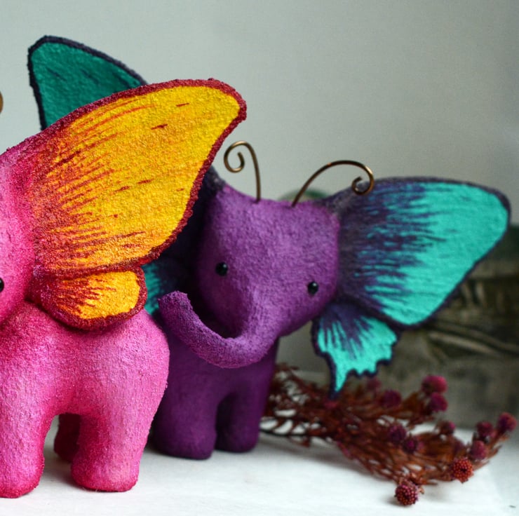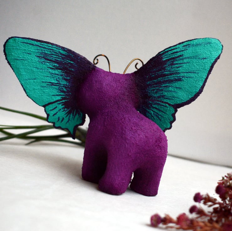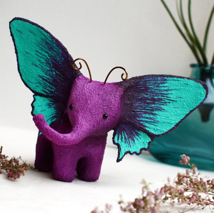This utterly adorable little elephant might be visiting us from an alien planet, or perhaps it has escaped from a particularly quirky book of fairytales! Regardless, it is now looking for a loving home. It has butterfly wings for ears and a wonderfully bright purple and turquoise colour scheme that will cheer up any nook or shelf.