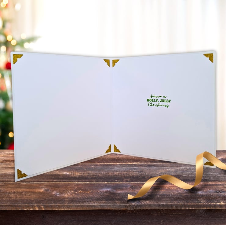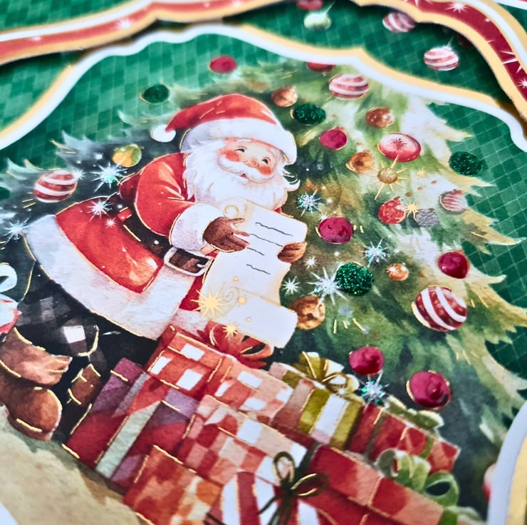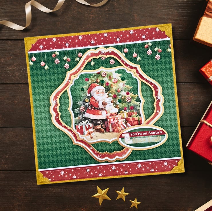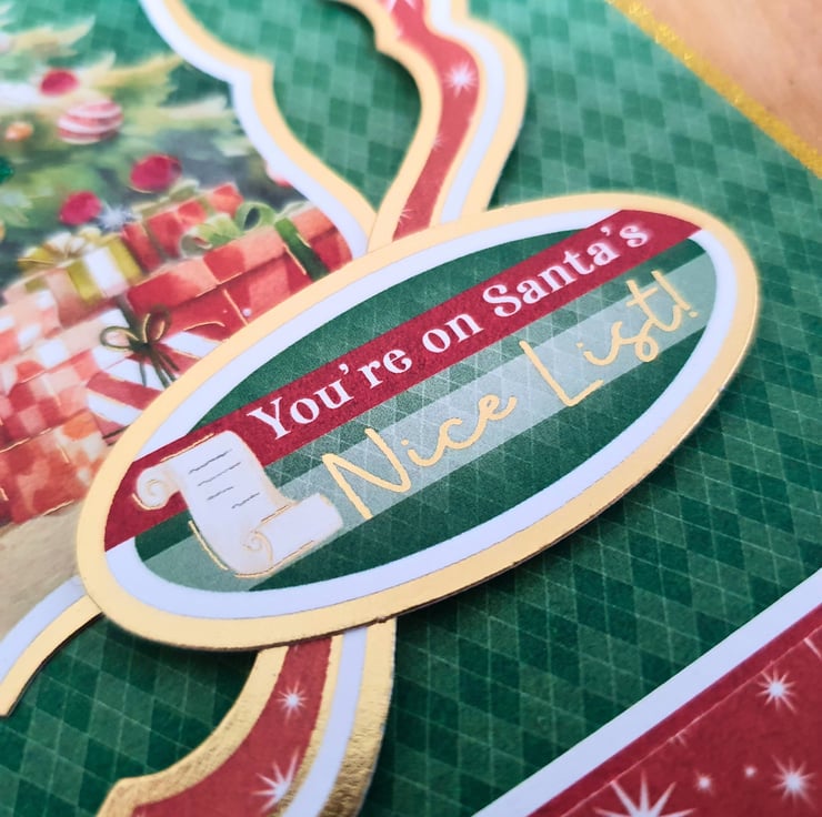 The card consists of mats of gold glitter paper & Xmas patterned luxury cardstock in green & red, with printed hanging baubles at the top. The main rectangular topper lays in the middle, surrounded by a gold foiled frame & followed by the sentiment tag that reads "You're On Santa's Nice List!" The card is embellished with colour accents on some of the baubles. Finished with an insert stamped with the message "Have A Holly, Jolly Christmas", & bordered with matching, decorative photo corners.