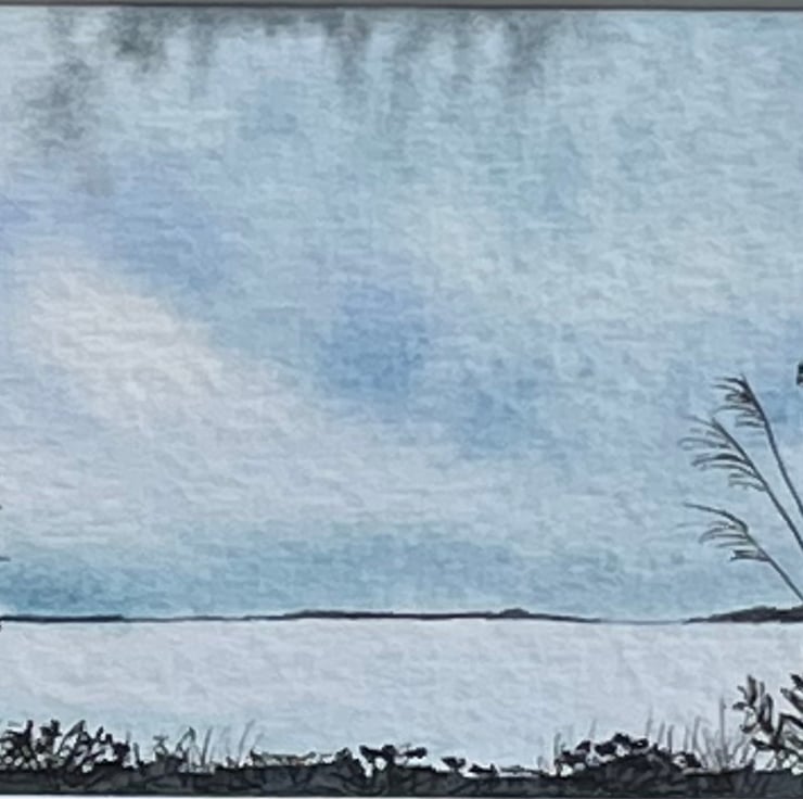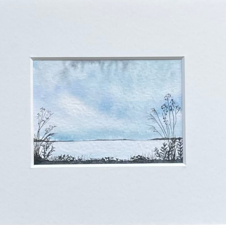 ACEO - Original watercolour painting in blue hues with ink pen silhouette of flower and grass seed heads.