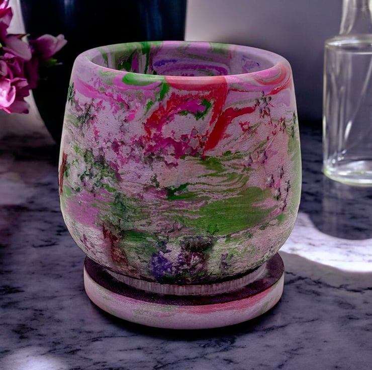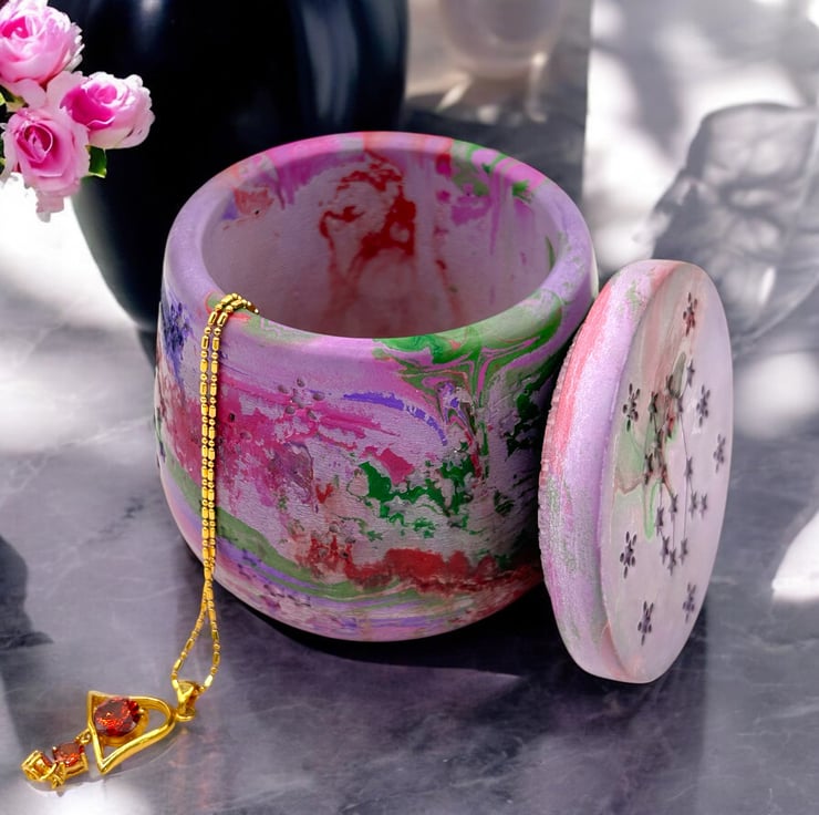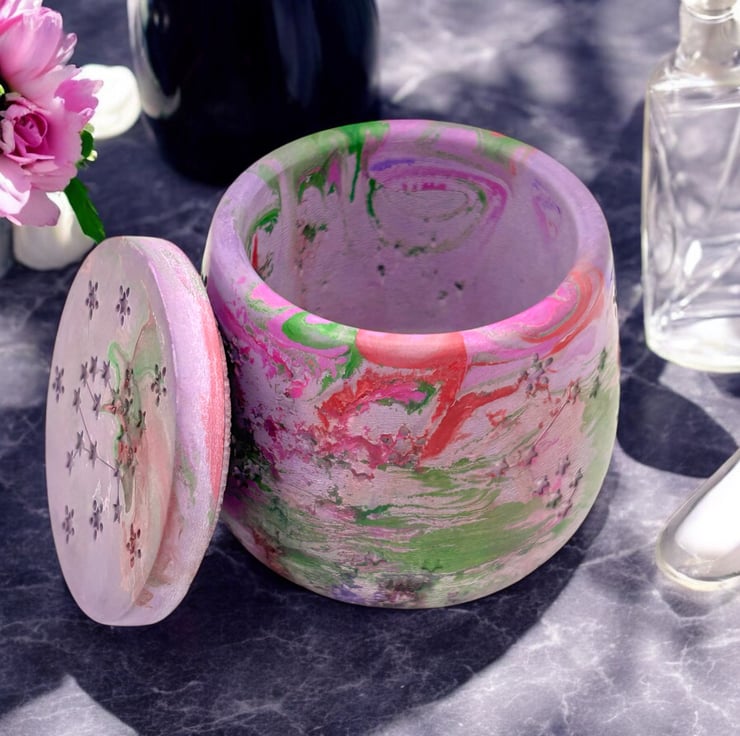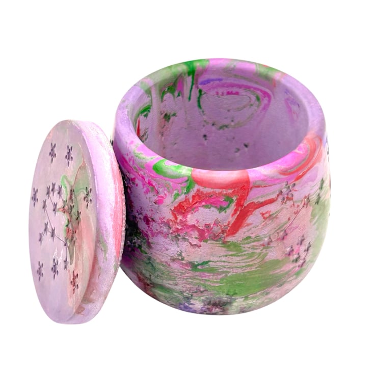 It is perfect for storing your keepsakes, trinkets, jewellery, or small treasures. Additionally, it can be used as a candle jar for tealights or small pillar candles; the lid can then double as a coaster to protect your surfaces from heat. The beautiful Aurora Borealis marbling effect makes each trinket pot a unique piece of art, making it an ideal gift for a special person or a lovely treat for yourself.