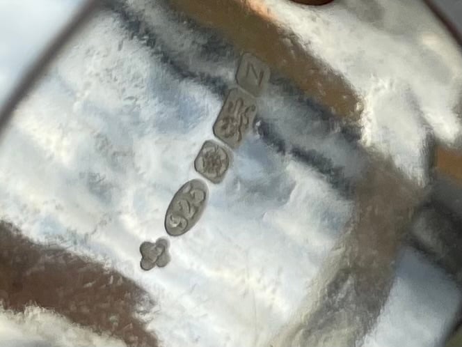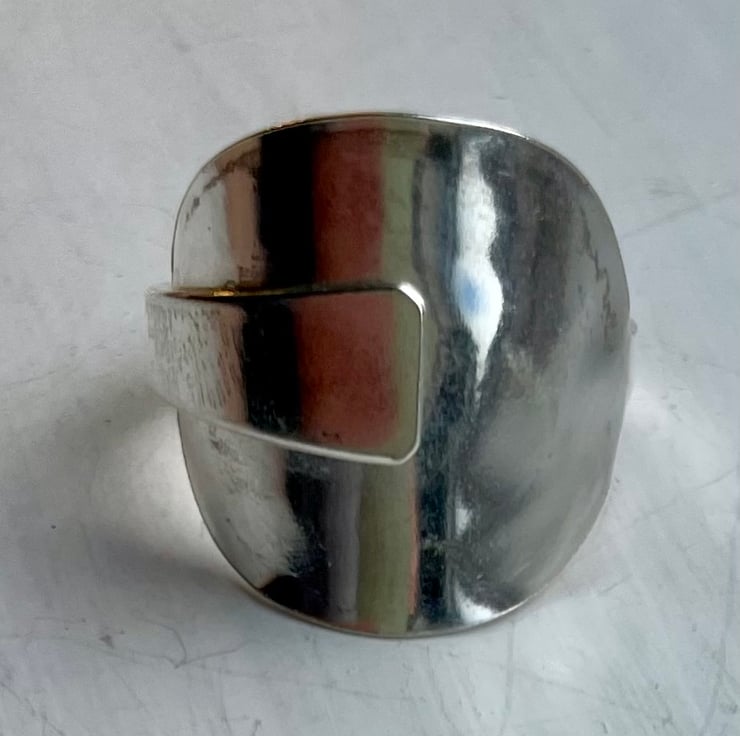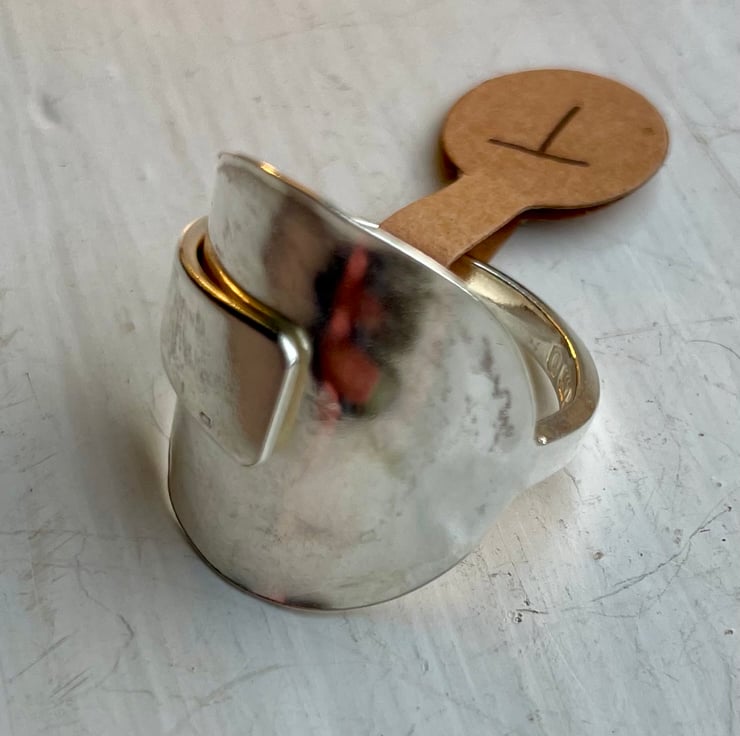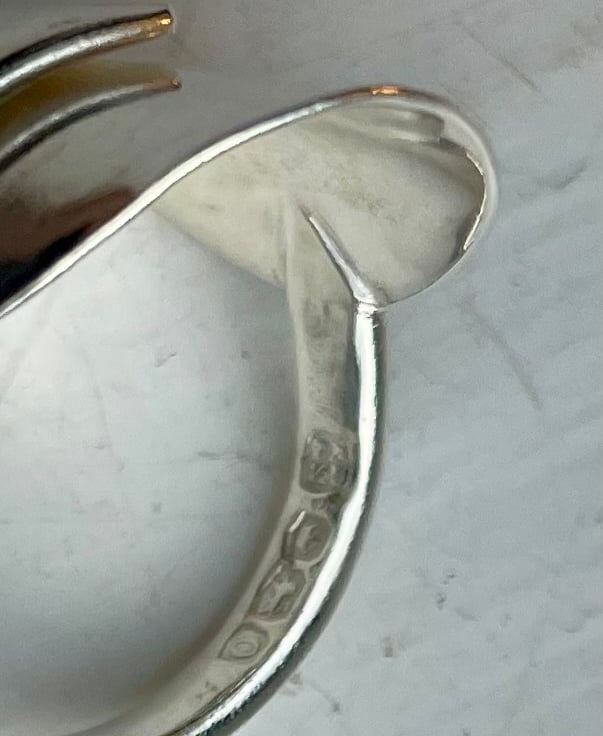 The bowl of the spoon has been flattened and the handle wrapped around to form the ring, The original hallmark can be seen on the inside of the band and the new hallmark signifying the change of use is on the underside of the flattened bowl.