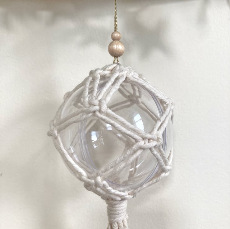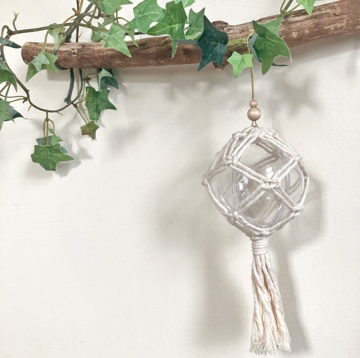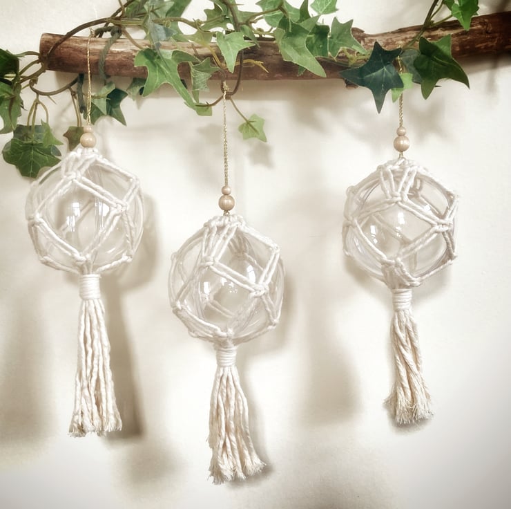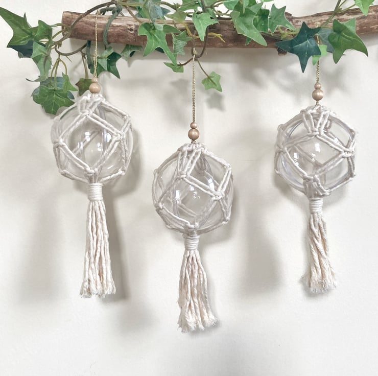 A set of 3 unique baubles using clear plastic baubles and traditional macrame techniques, reminiscent of coastal glass floats.