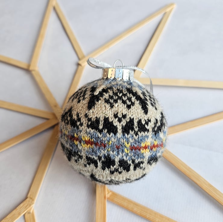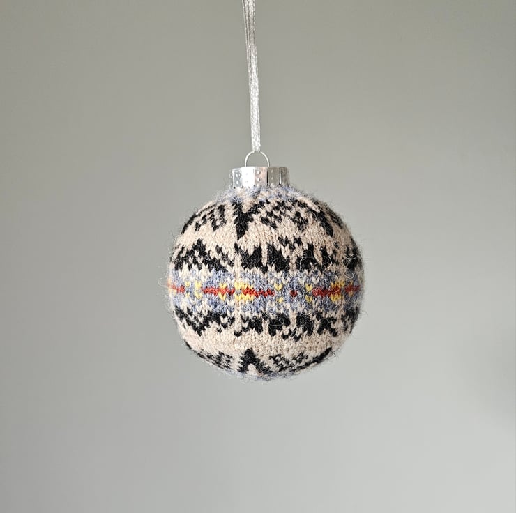 This Fair Isle bauble is my own design and is hand knit in 100% Shetland wool. Perfect to purchase as a treat for yourself, or as a gift for a loved one. To be hung on a Christmas tree or as part of other decorations around the house. Fair Isle can be used and displayed year round and not only at Christmas.