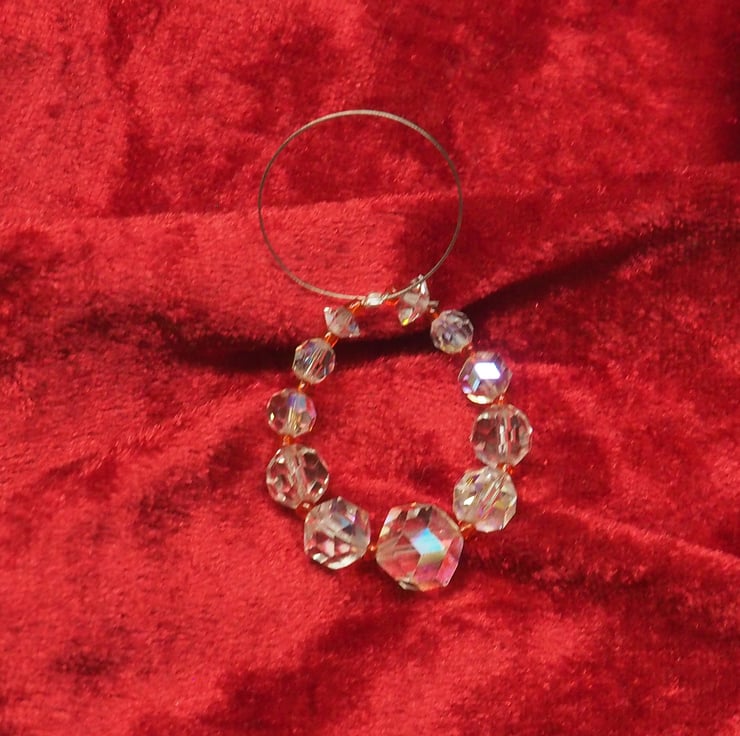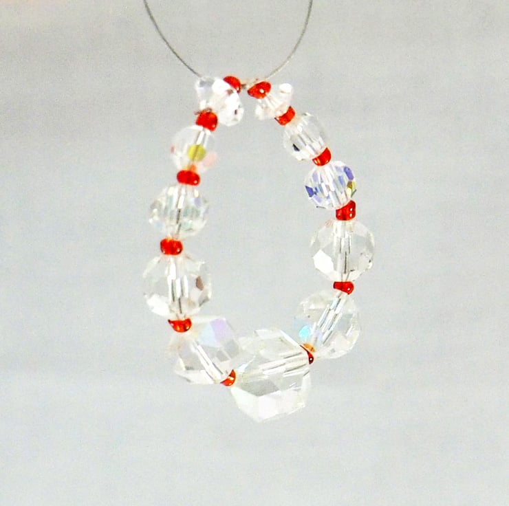 The ornament is created by stringing onto fine beading wire, at each end is a small bicone crystal, to make the circle the wire is threaded back through each end and held in place with a silver coloured crimp.