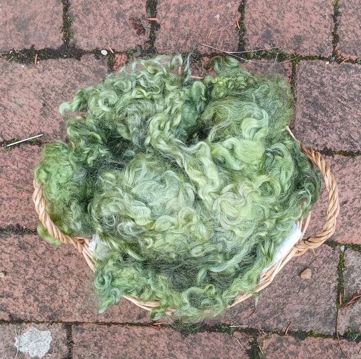 This fleece is from our Autumn shear, it is hand washed. The natural fleece comes in many shades of grey which when overdyed with Leaf Green gives a variety of green shades. The locks are in soft curls approximately 9cm in length.