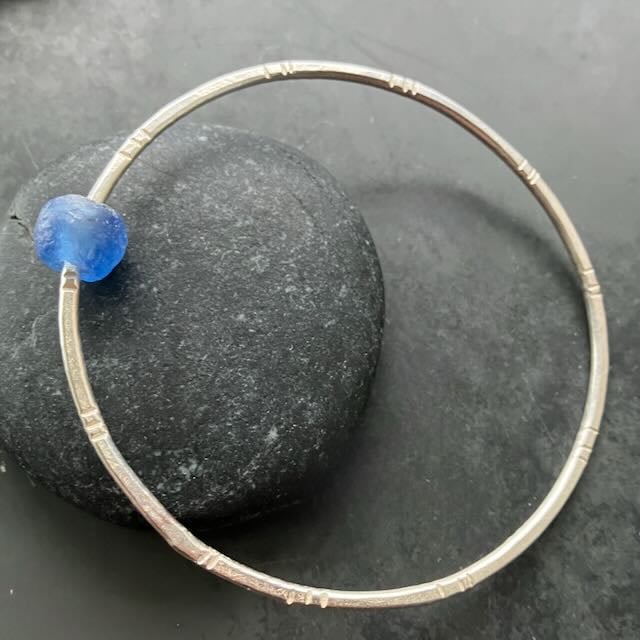 I have made a sterling silver 2mm hammered bangle which has a free running recycled glass bead. The bangle is hammered flat and I have incised a simple pattern on the front and back. The beads come from Ghana when I was on a study trip 15 years ago. I visited the workshop where they were made and watched the process. All the beads were made from collected and recycled bottles.