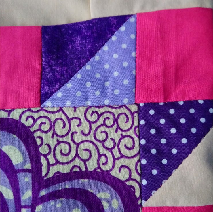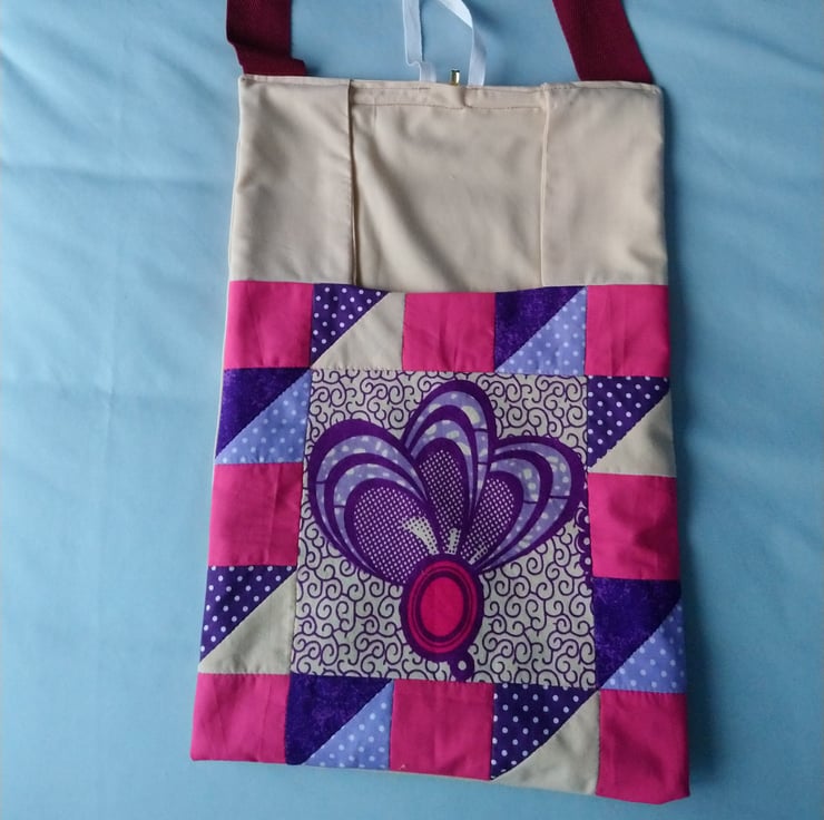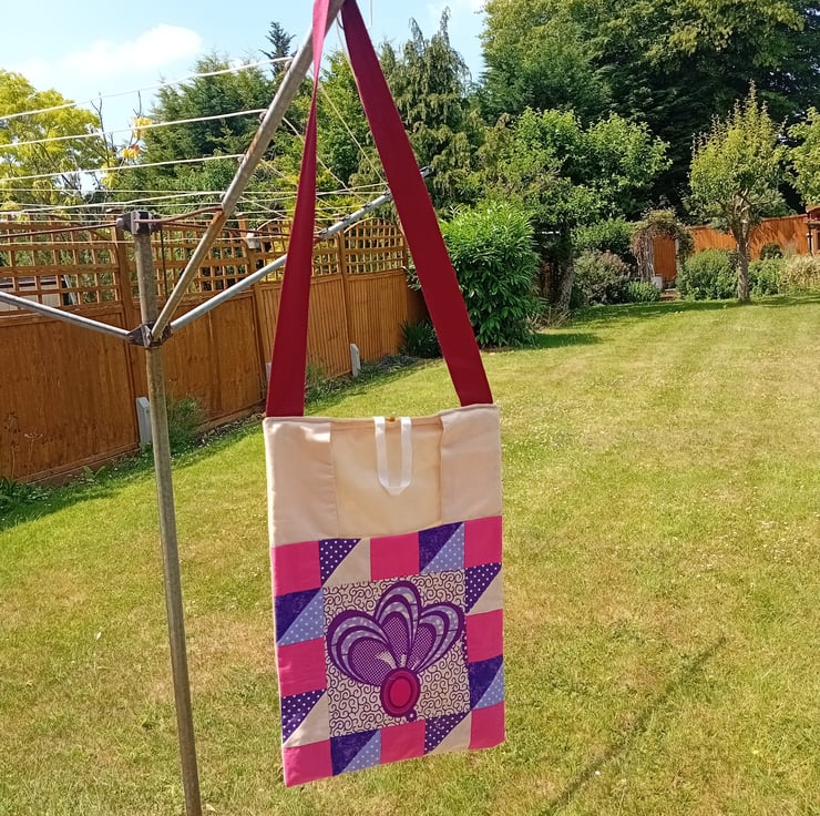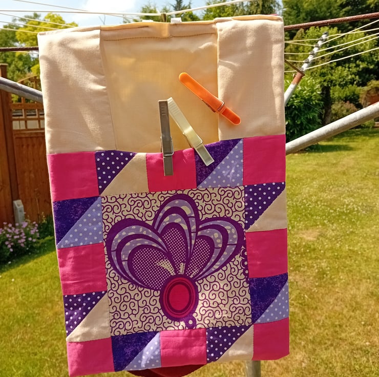 Peg bag in bright cerise, purple, mauve and cream patchwork. Fully lined in plain cream. The back of the bag is plain cream too.