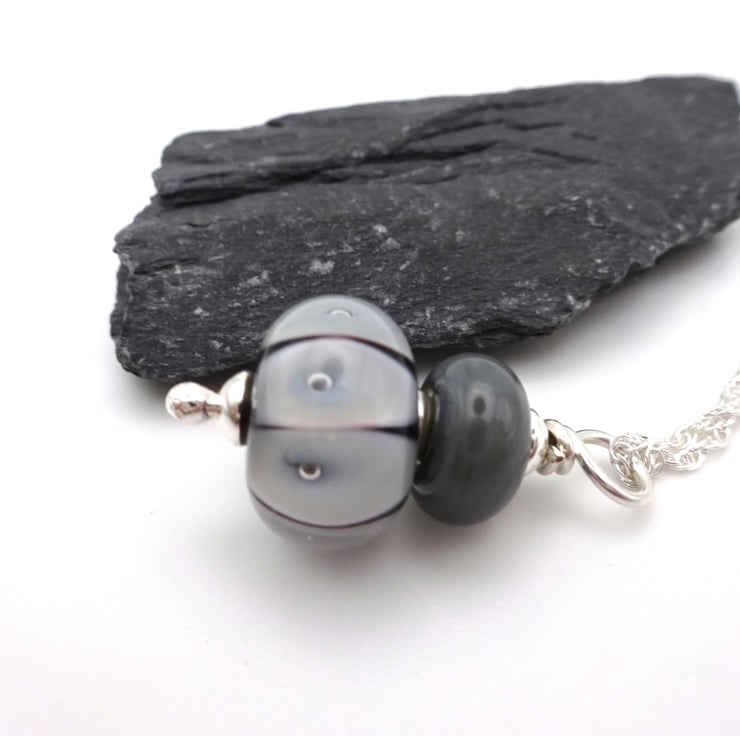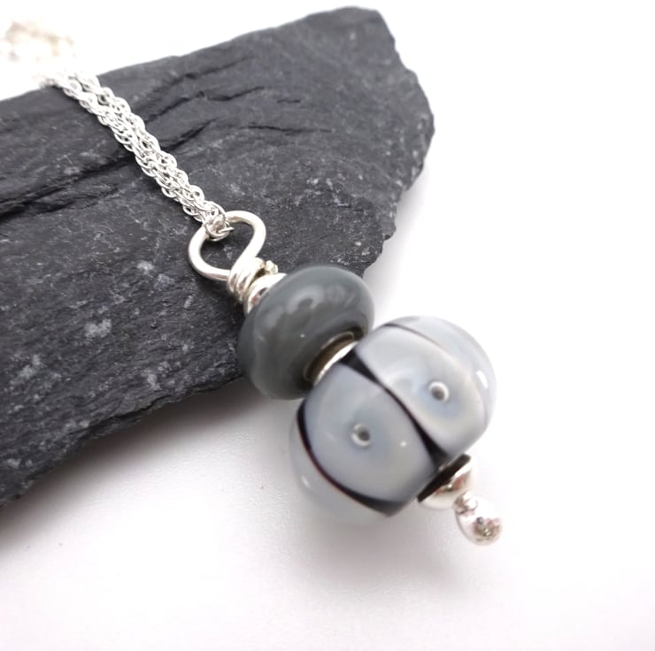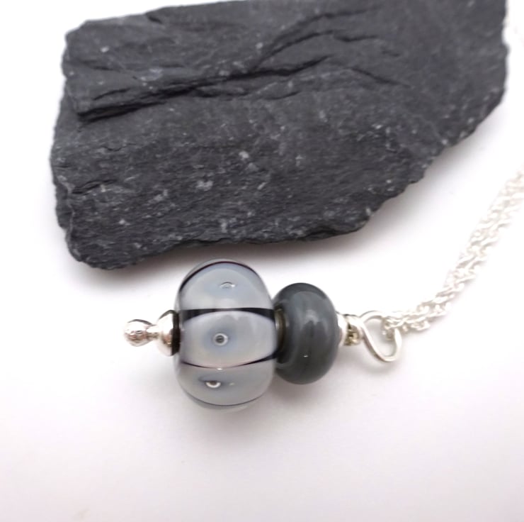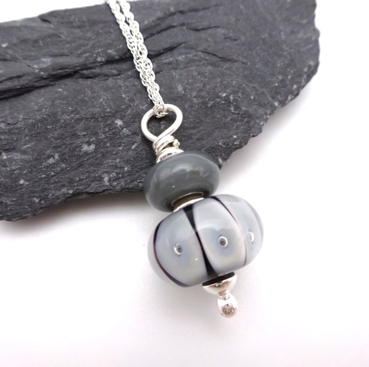 A sterling silver chain featuring a handmade lampwork glass pendant.