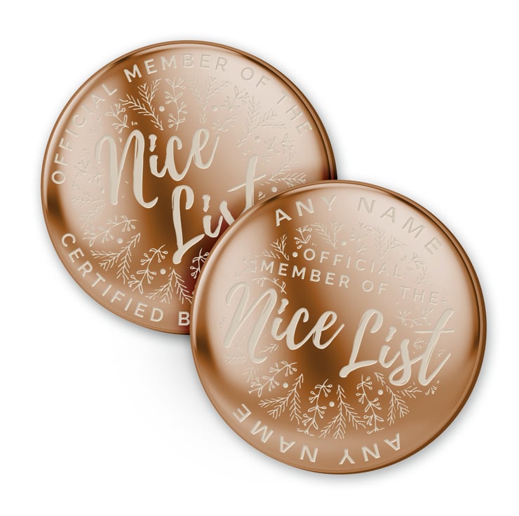 Celebrate being on Santa's "Nice List" with our Member of the Nice List Coin, personalised with any name! This festive coin is the perfect Christmas keepsake, featuring a beautiful festive design and a special certification that makes it officialyou're on the Nice List!