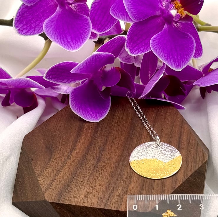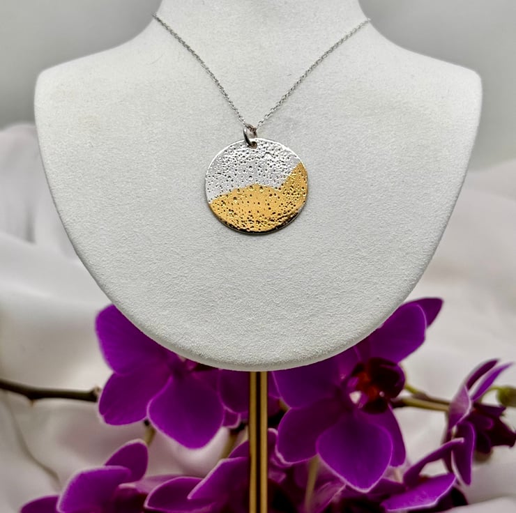 One of a kind Fine Silver and 24ct gold Necklace. I have handmade this necklace using eco-friendly silver metal clay and 24ct gold. I texture and shape the clay, refine then kiln fire. The result is solid 999 fine silver. I then fuse the 24ct gold foil to the silver using an ancient Korean gilding technique called Keum boo. The surface texture and application of the gold foil are done by hand resulting in a bespoke design.