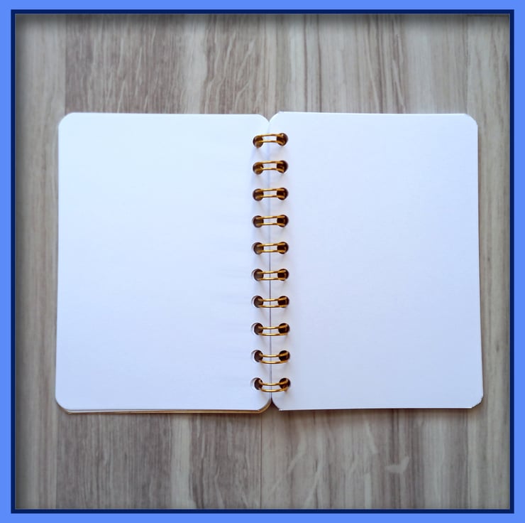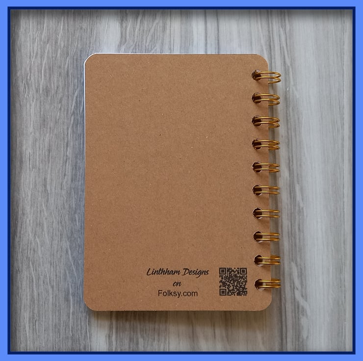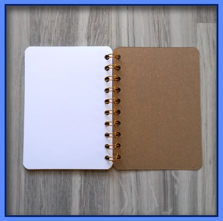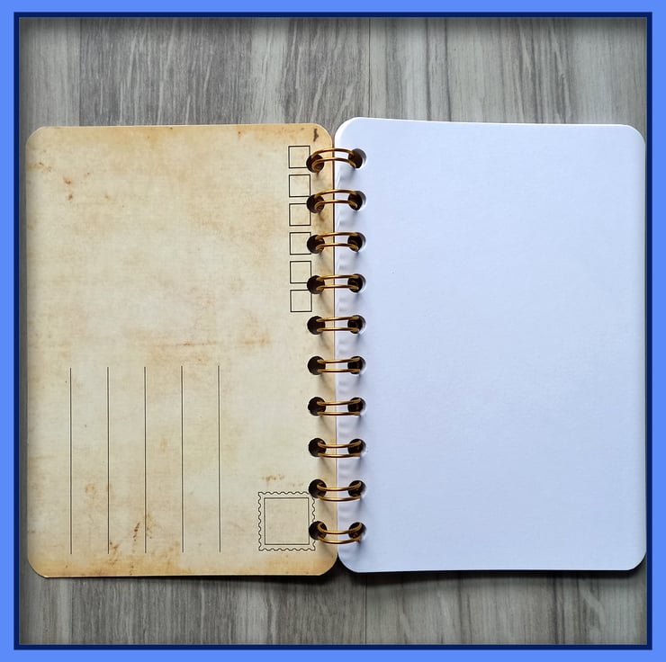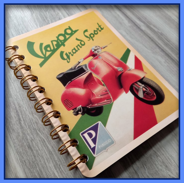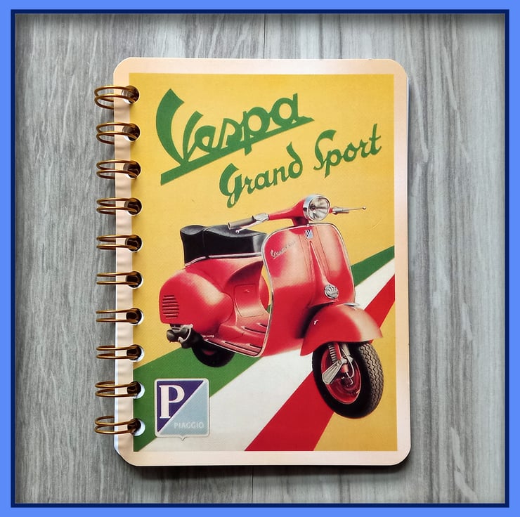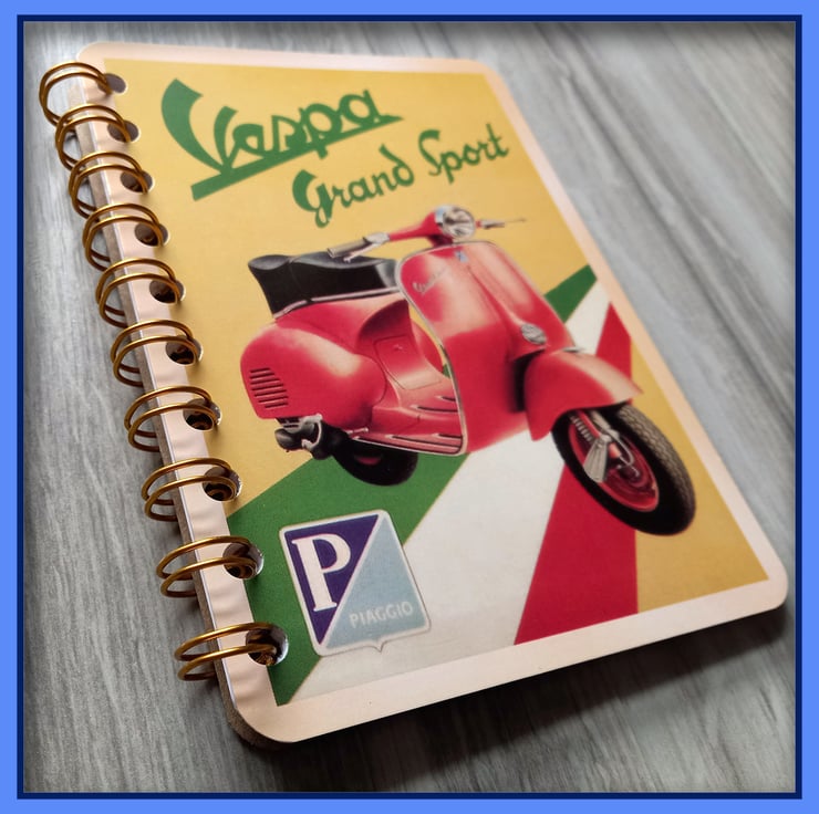 This wire bound Notebook has a front cover made from reproduction Postcard Vespa Grand Sport Scooter advert. A true icon of the 60's. There are 20 pages (40 sides) white paper, which have been sprial bound with Gold wire, the back cover is brown card. The over all size is 10cm wide by 14cm high, ideal size to pop in a coat pocket or bag, ready for you jot down notes or sketch. Great gift for a Scooter lover or or Mod, good size to pop into a Christmas Stocking