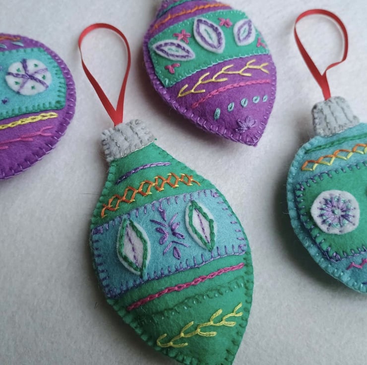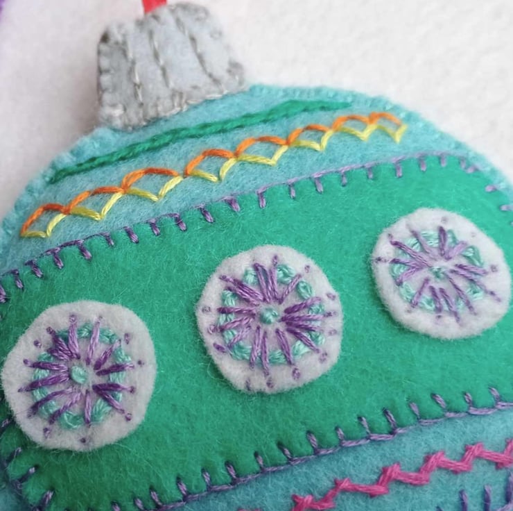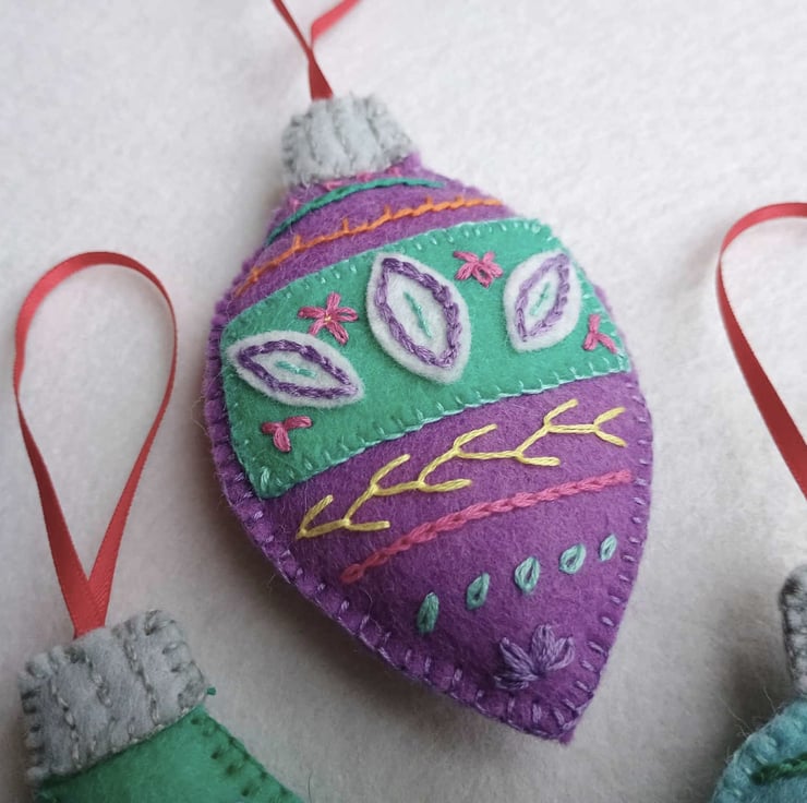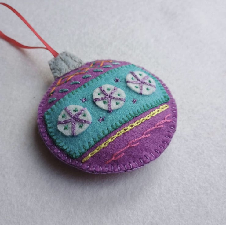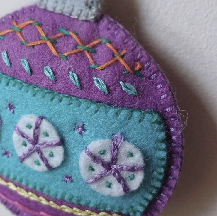 Based on a retro palette of purple, turquoise and blue, I hand cut the wool felt before accenting the front with embroidery stitches in co-coordinating cotton embroidery threads. I don't follow a stitching pattern, but let inspiration come as I sew each motif and row by hand, meaning each bauble is unique.