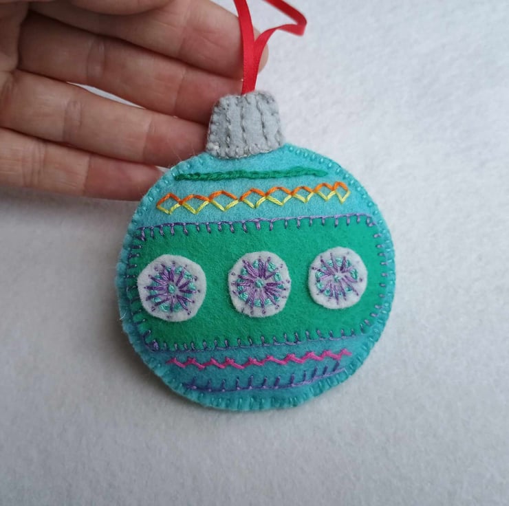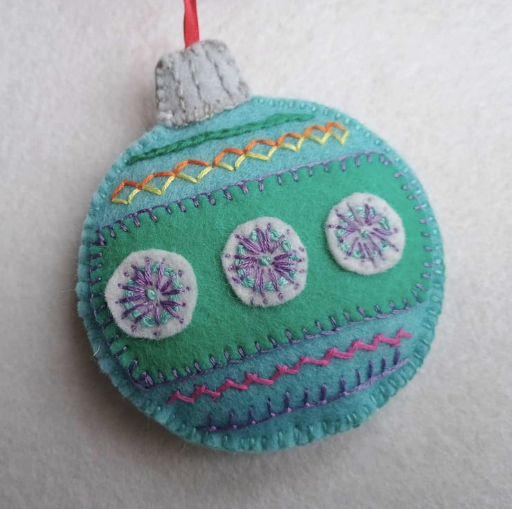 Hand embroidered with traditional stitches, my retro themed felt bauble would look stunning on a Christmas tree or decorating a beautiful wrapped present.
