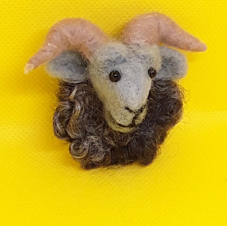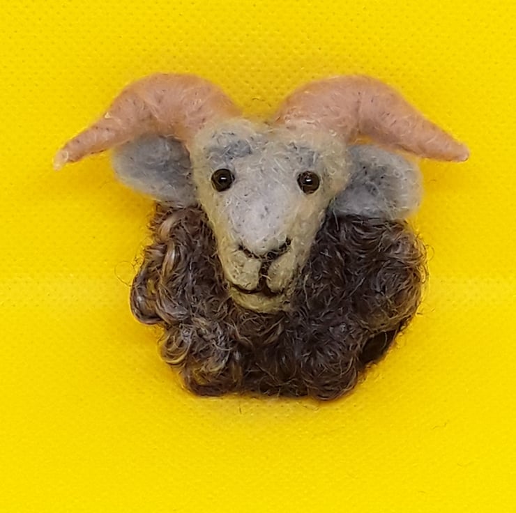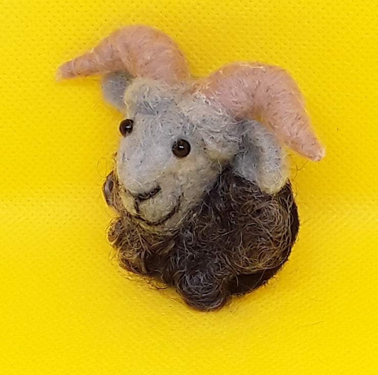 A cheeky looking grey faced Ram, needle felted ram brooch with his locks of wool fleece made from Wensleydale locks sourced from a uk small flock of sheep.