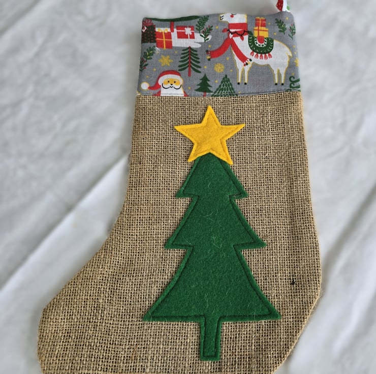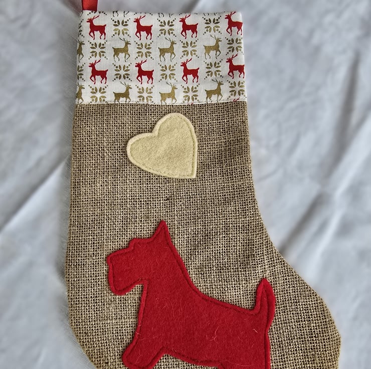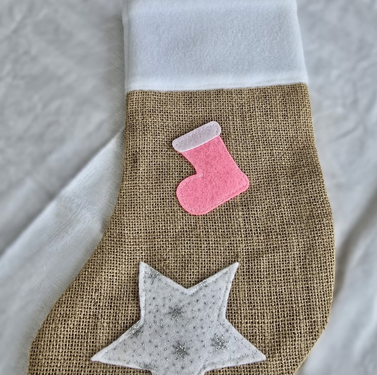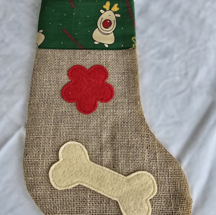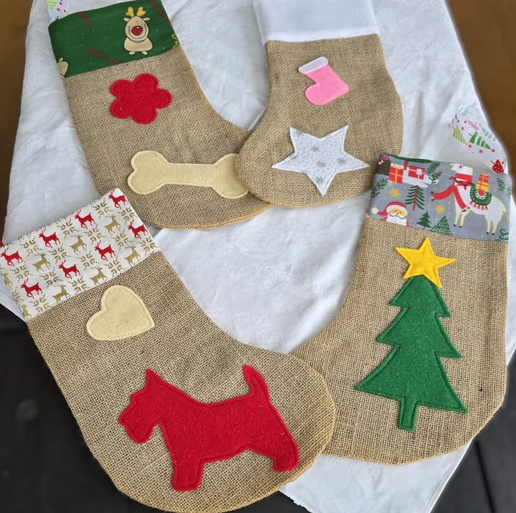 Cute pet Christmas festive stockings to spoil your pets, cute hessian stockings with felt motifs and topped with Christmas themed fabrics.