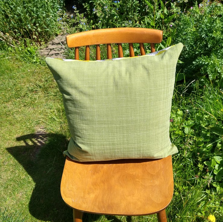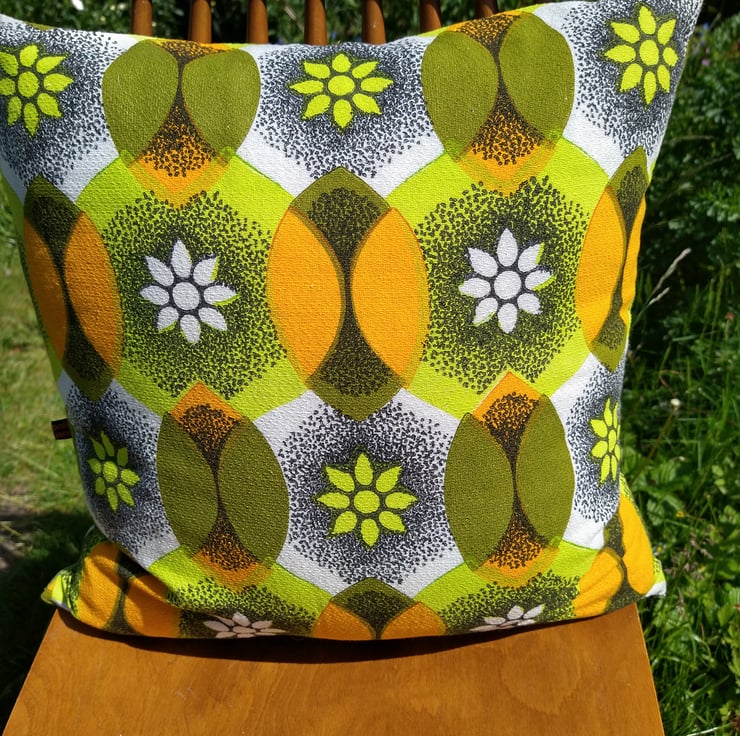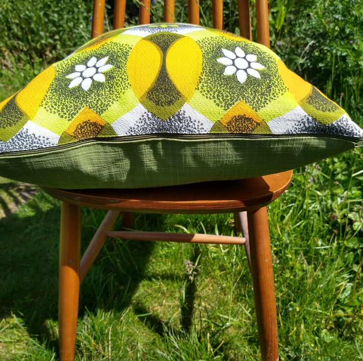 Cushion cover handmade with vintage 60's fabric on the front and a coordinating plain fabric on the back. Coordinating zip for easy removal. Fits 50cm x 50cm inner.