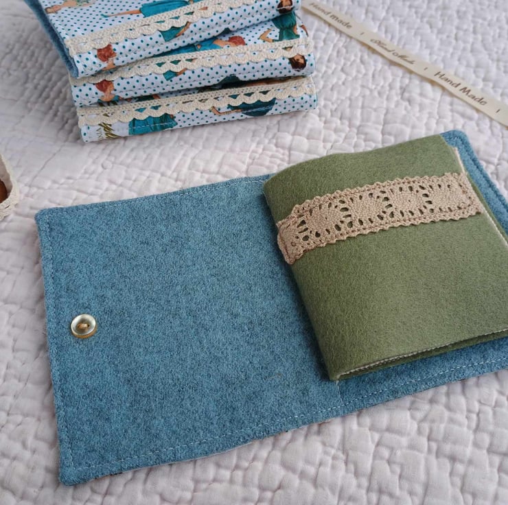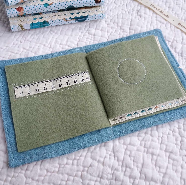 Inside the case you will find 4 leaves of green wool felt, trimmed with vintage style lace and ribbons. These include: