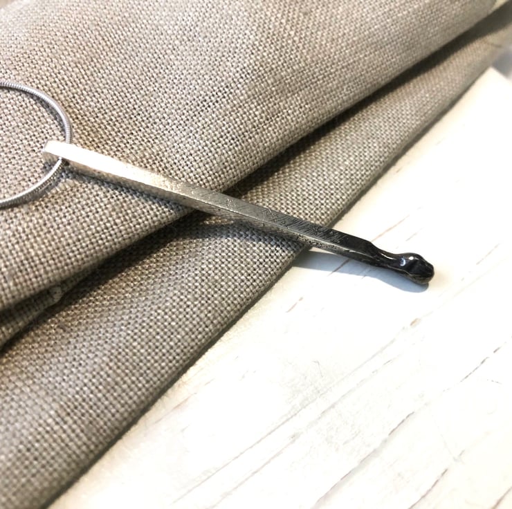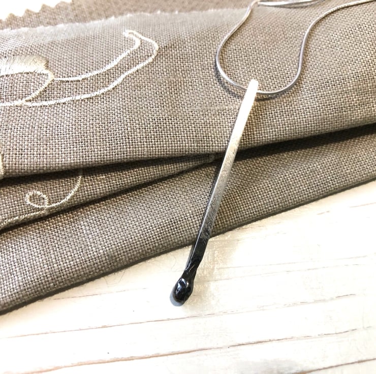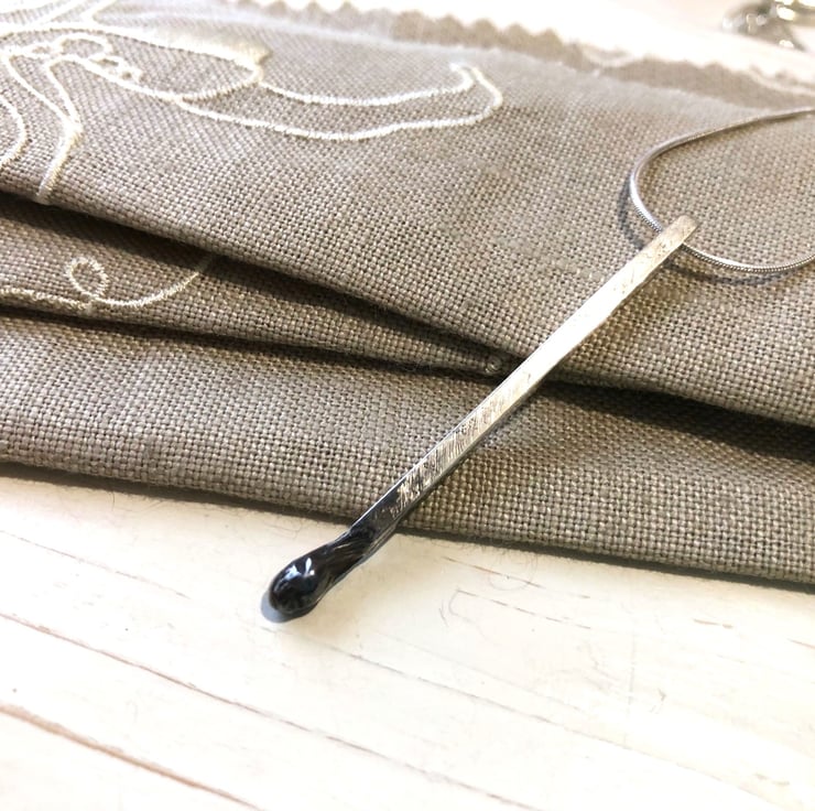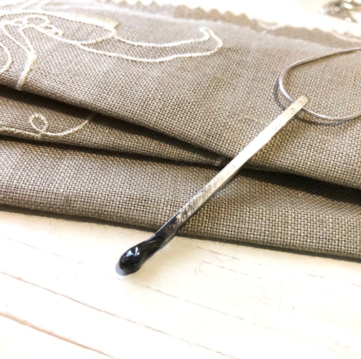 Now for something a little different. A simply styled pendant in sterling silver in the shape of a spent matchstick. Forged out of recycled silver the end has been shaped so it looks like it has been lit and is patinated black. These would be quite a talking point at a party I think. I made myself a pair of earrings like this and they are noticed and commented on every time I wear them.