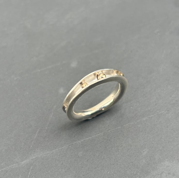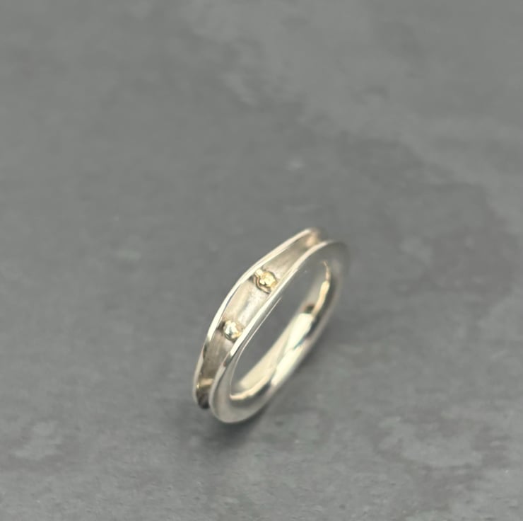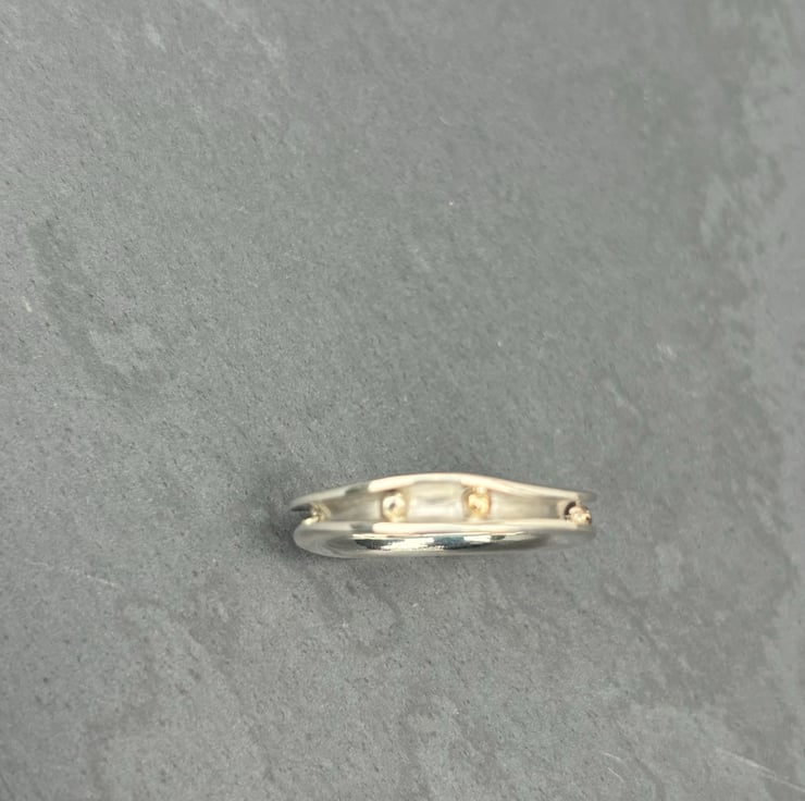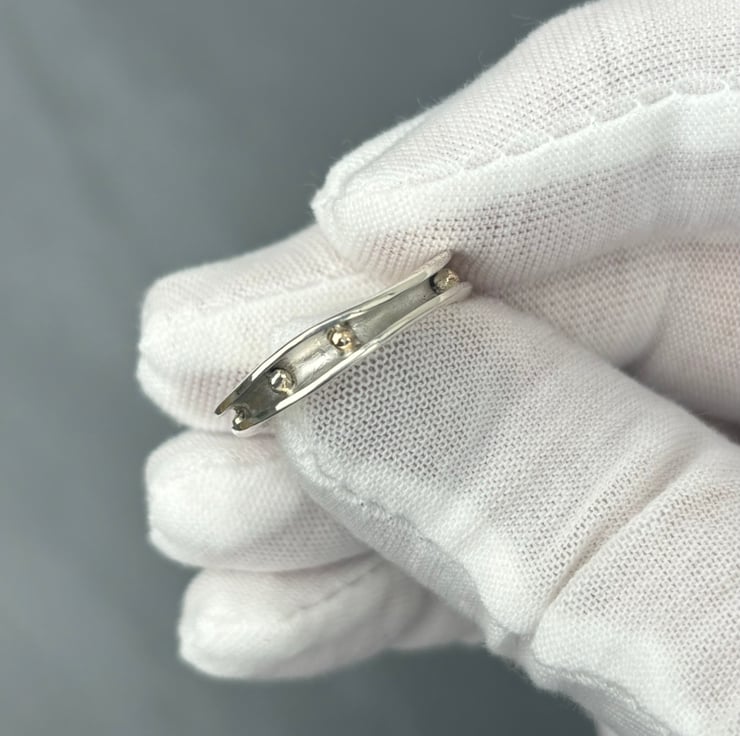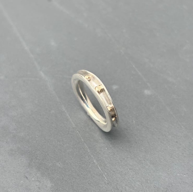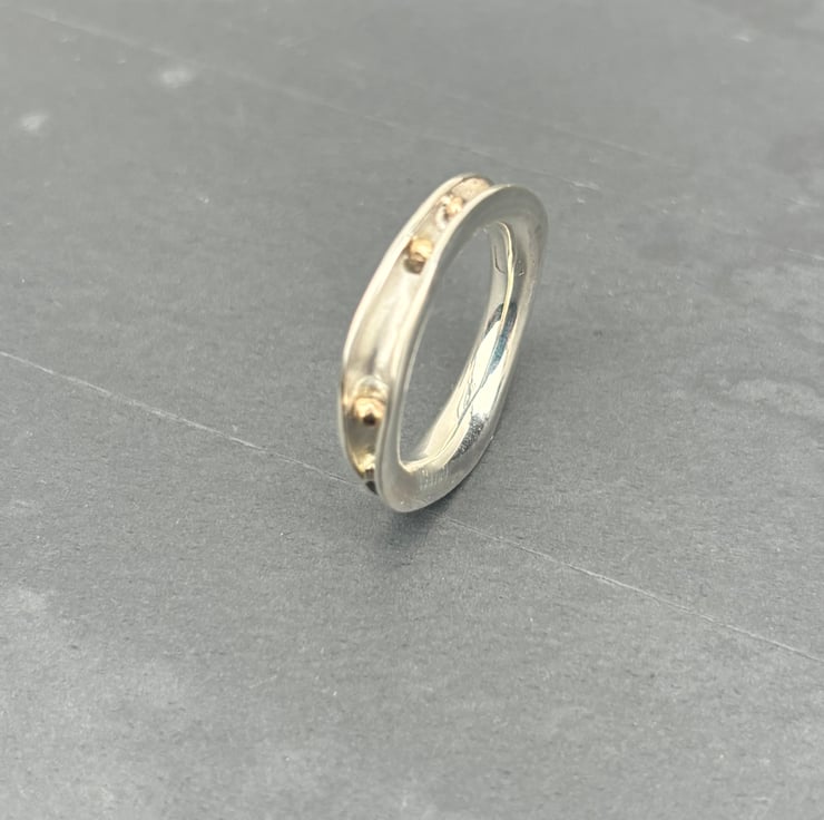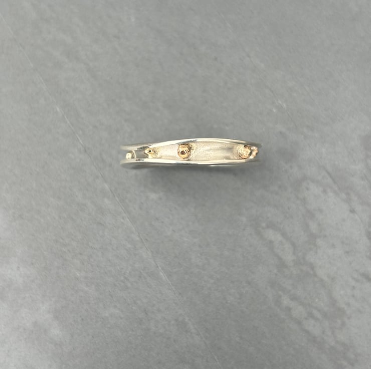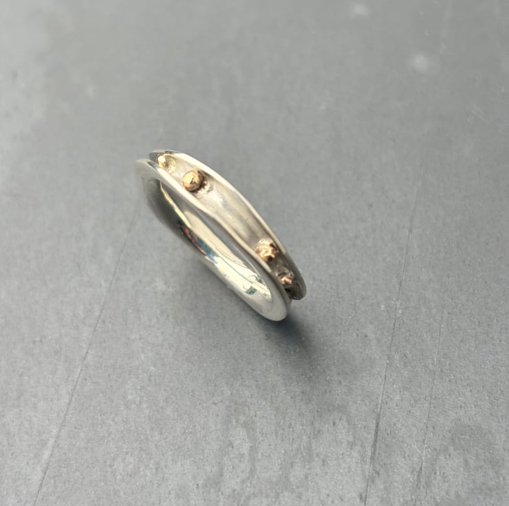 This Silver and Gold freeform ring is made from Sterling Silver and features 9ct gold ‘bubble’ detail. The ring sits very comfortably on the finger and the diameter at its widest measures approx: 5mm wide but varies around the ring.