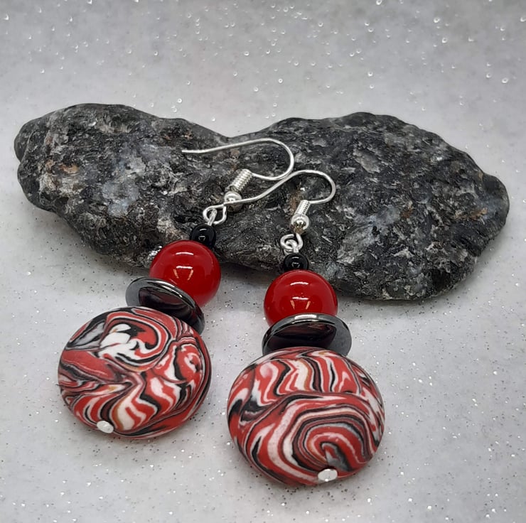 The handmade disc shaped bead measures approx. 19.2mm with an 12mm hematite saucer spacer, a 10mm red round bead and black seed bead to complete the look