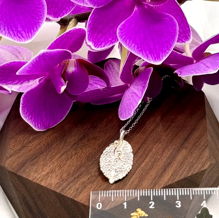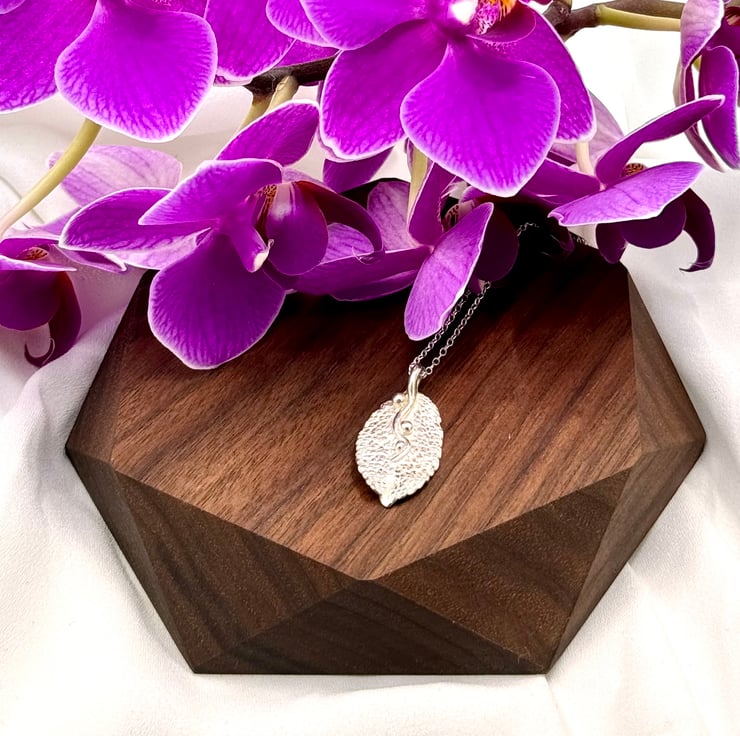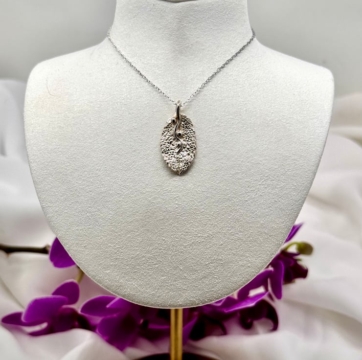 Fine silver, mint leaf necklace. I have handmade this necklace using eco-friendly silver metal clay and a mint leaf. I apply metal clay paste onto the back of the leaf, then kiln fire it resulting in solid 999 fine silver. The surface texture is individual to each leaf, making this a bespoke necklace design.