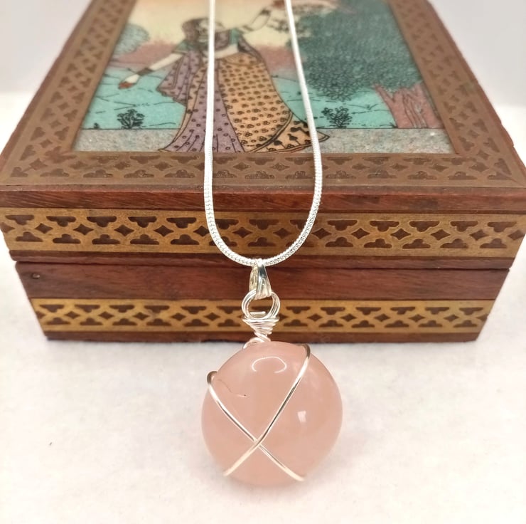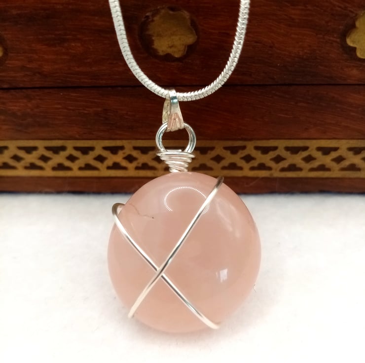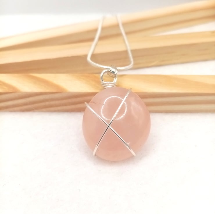 Wire wrapped natural rose quartz tumble stone with silver plated snake chain.
