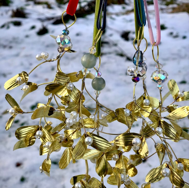 Made from embossed brass foil, brass wire and pearl coloured beads with crystals, this pretty bunch of mistletoe won't fade with the memories. Keep it as a family heirloom for next year.