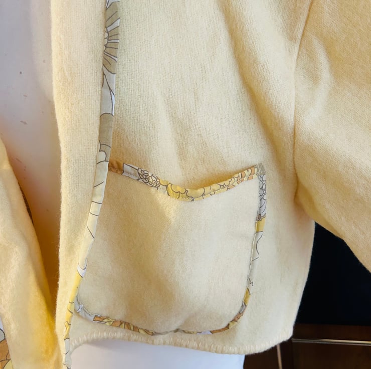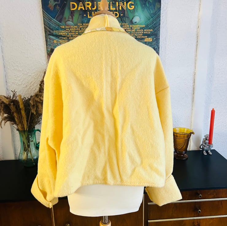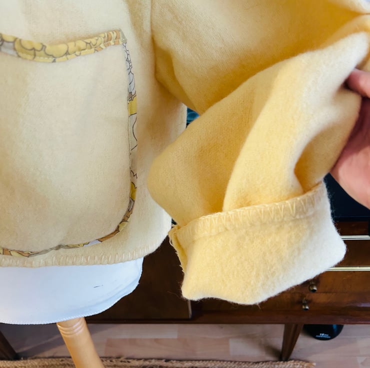 Handmade by Let Them Stare Vintage butter yellow oversize edge to edge jacket with pockets. Made from a vintage wool blanket. One of a kind. Turn over cuffs.