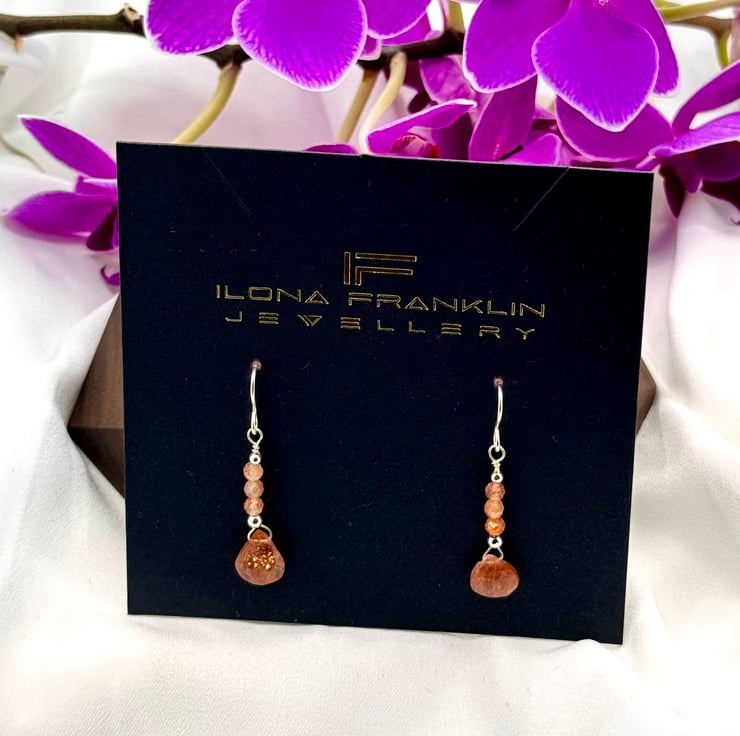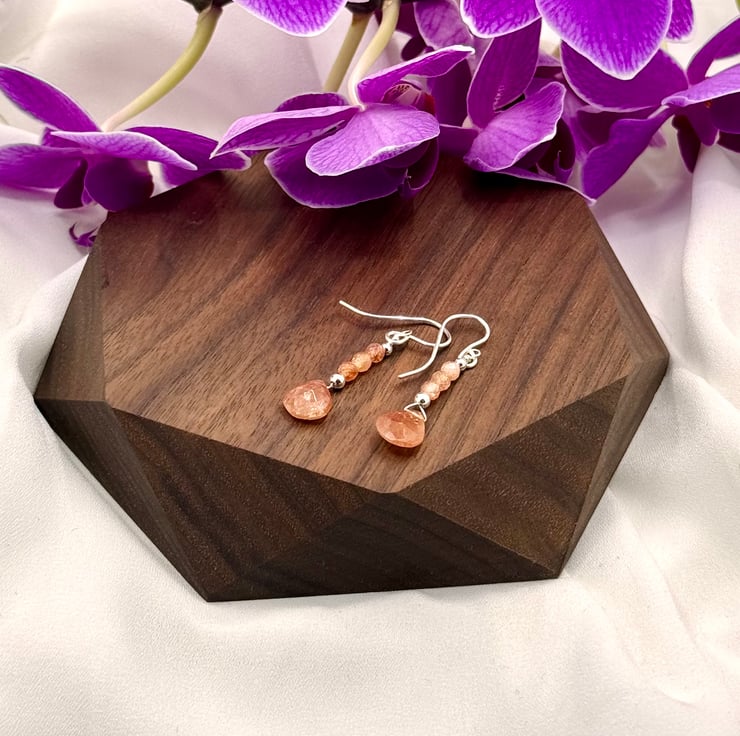 Sterling silver wire and earring wires. 2mm micro-faceted rondelles and 8mm faceted heart briolette sunstone semi precious gemstones
