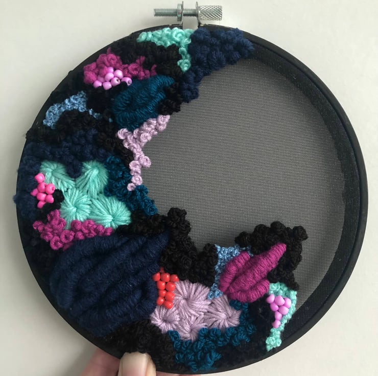 Highlights a 6 inch one of a kind hand embroidered art piece. Embroidery thread, yarn and beads have been hand embroidered onto a black organza in an abstract pattern. This has created an art piece which is both eye catching and unique a perfect addition to any home.