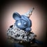Teon is a mouse who wears a liberty floral collar stitched with bronze bells. Under this bloom of pink, Teon wears a tender white-and-grey stripe. As imps go, Teon is rather calm. His head has been hand detailed with fur, and – like his paws – is a grey-stained porcelain. His tail is also a grey leather. Teon is weighted and made to be seated, however his limbs move at hip and shoulder.