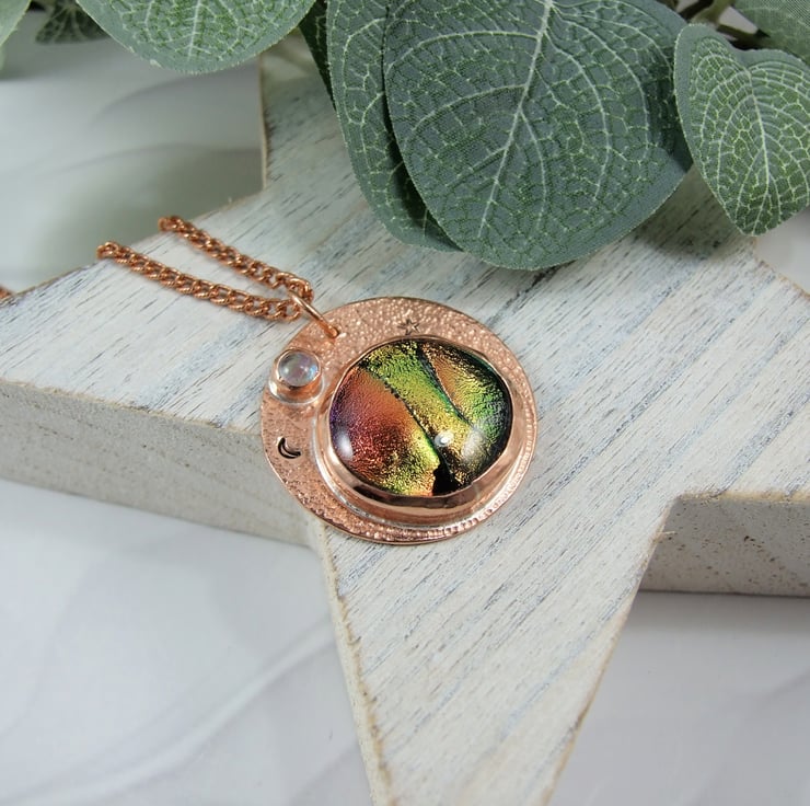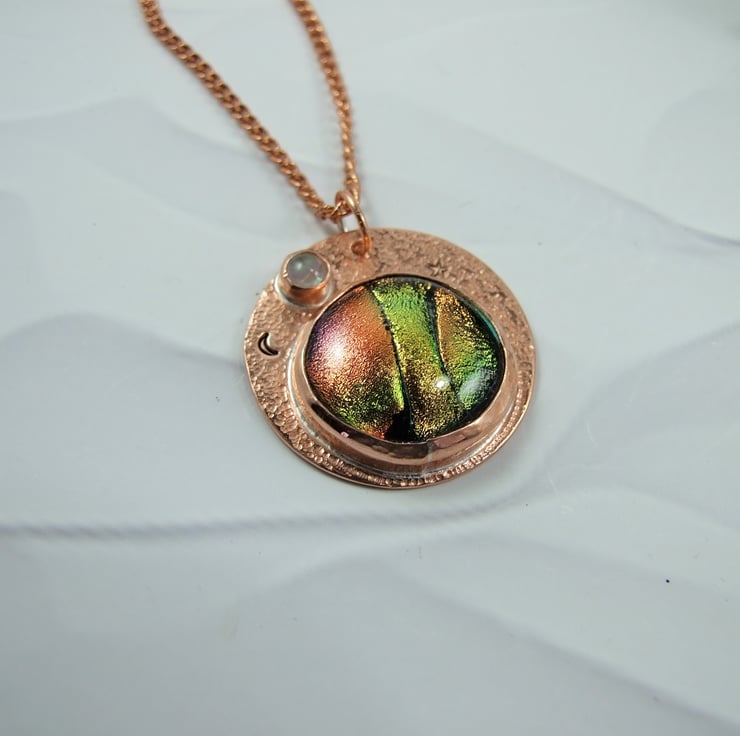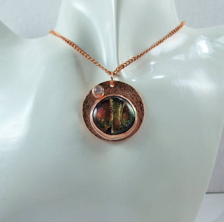 Sparkly Dichroic Glass and CopperNight Sky Necklace. Planet, Moon and Stars Pendant on pure Copper Chain.